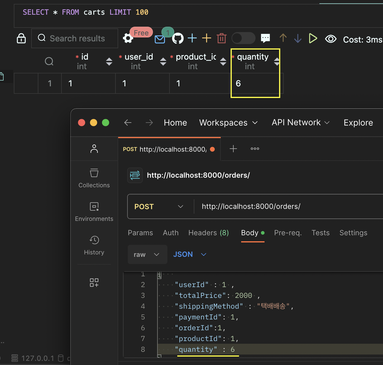 내가 req.에서 carts quantity를 받아오는 게 아니라,