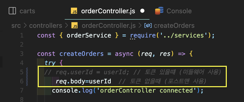 > postman을 활용할 때는 우리팀은 header에 token 없이 가기로 해서 => req.body = userId