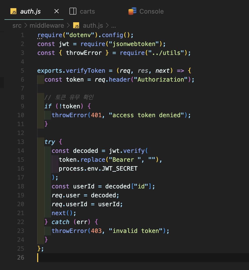 > middleware 활용할 때는 token 관련 코드가 거기에 담겨 있으니까 => req.userId = userId