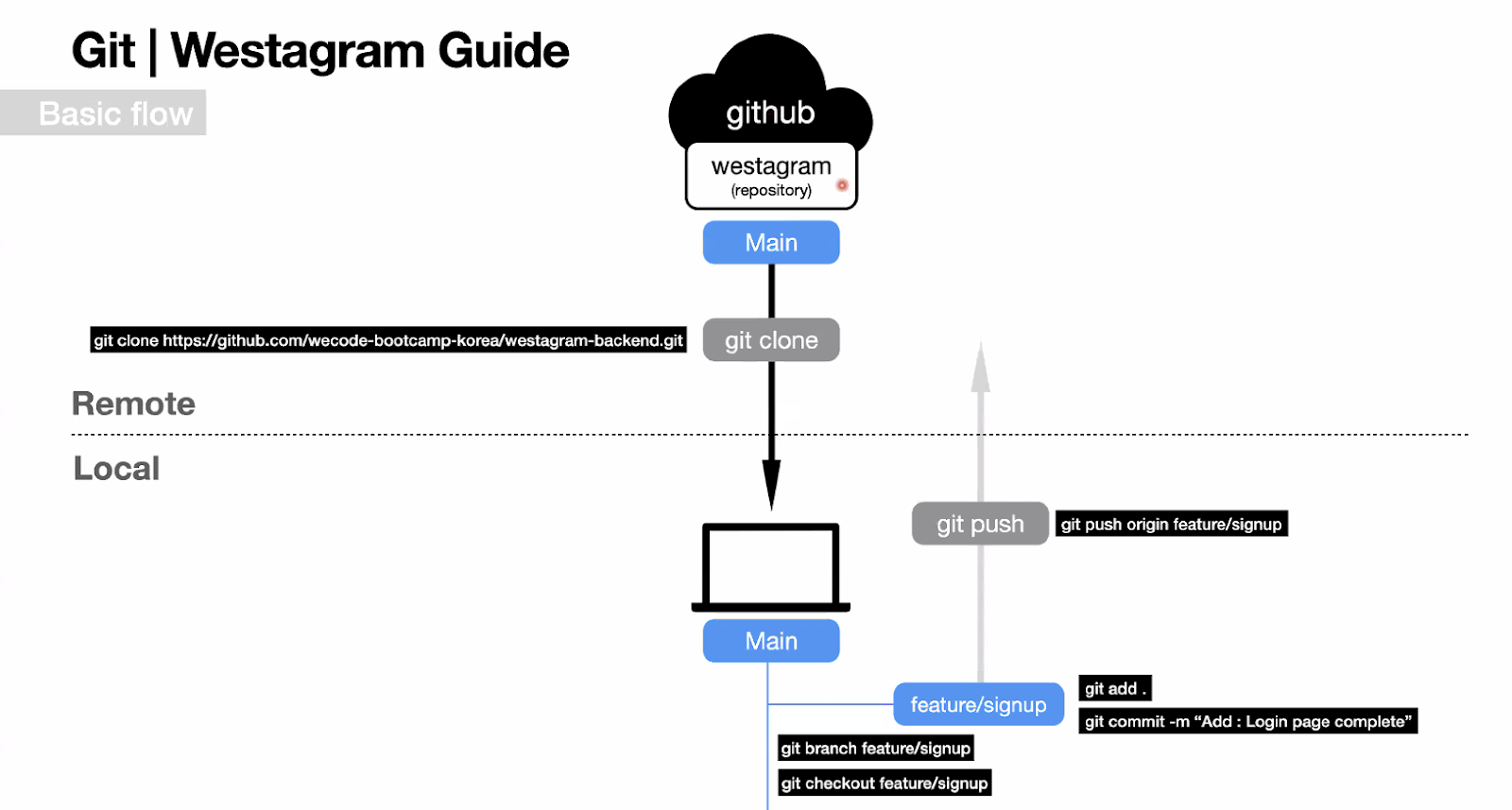 - Westagram 과제를 수행하며, Git ↔ Github 상 코드를 Push하고, Pull 받는 Flow를 체득합니다.