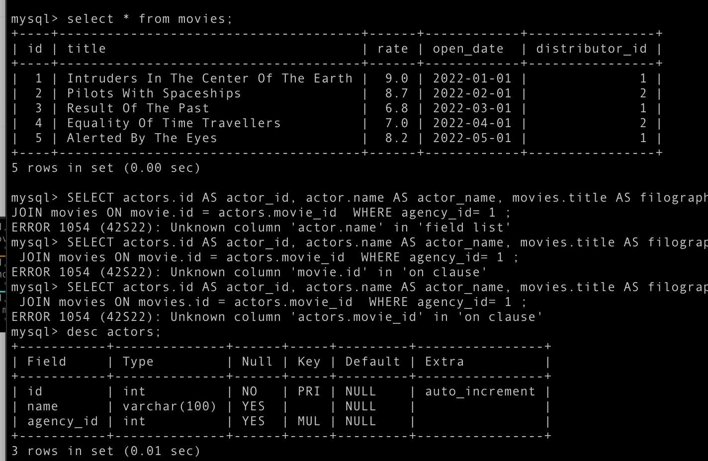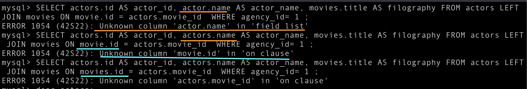 SELECT actors.id AS actor_id, actors.name AS actor_name, actors.agency_id, movies_actors.movie_id, movies_actors.actor_id FROM actors LEFT JOIN movies_actors ON actors.id = movies_actors.actor_id;