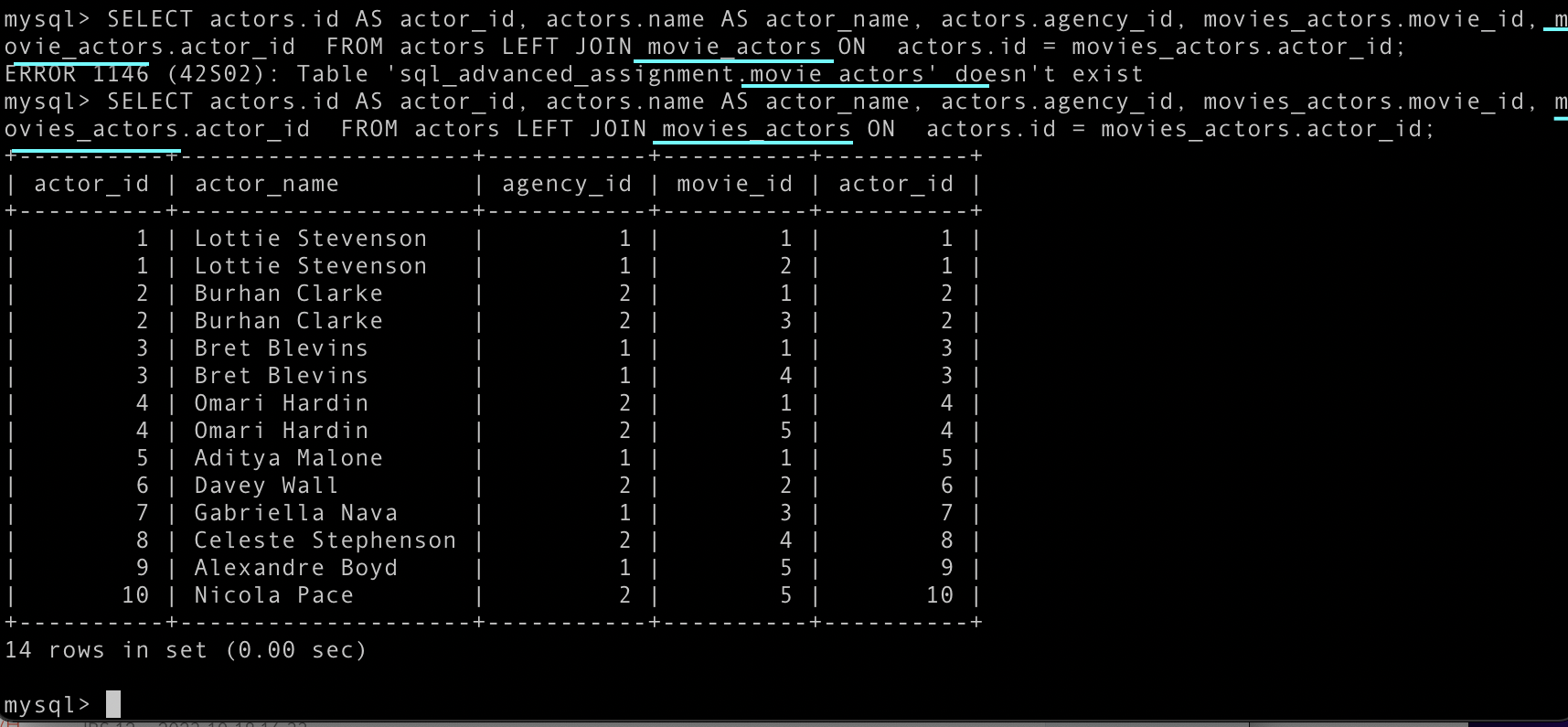 SELECT actors.id AS actor_id, actors.name AS actor_name, actors.agency_id, movies_actors.movie_id, movies_actors.actor_id FROM actors LEFT JOIN movies_actors ON actors.id = movies_actors.actor_id;