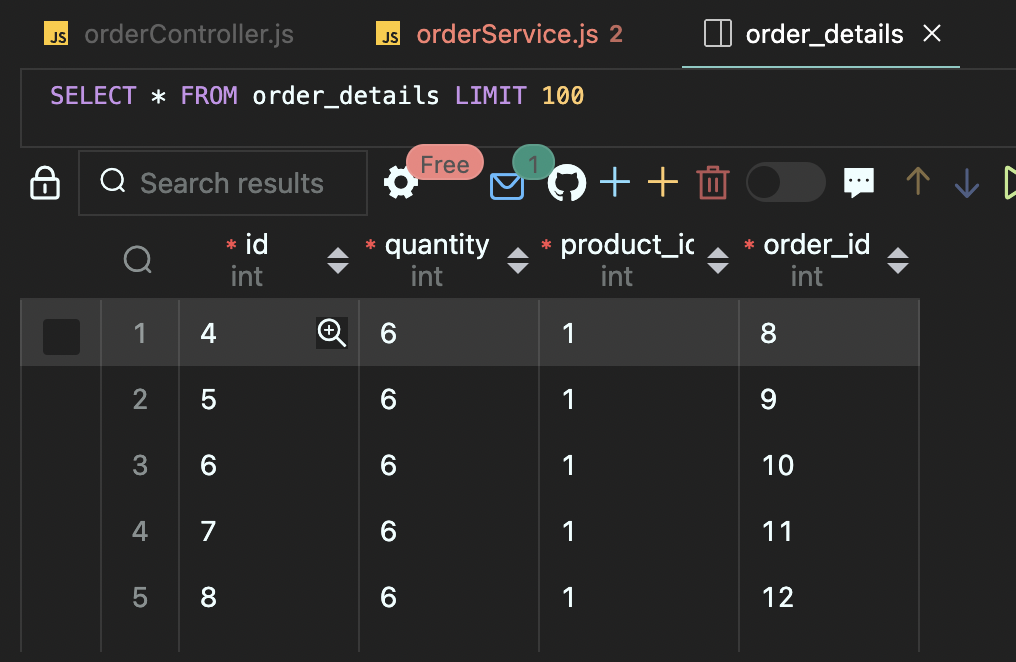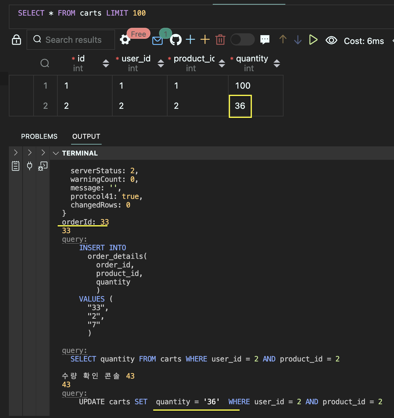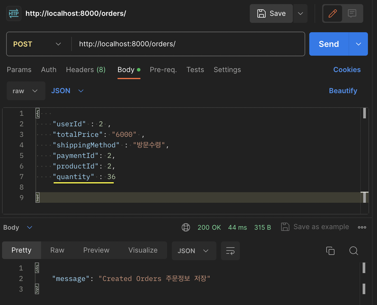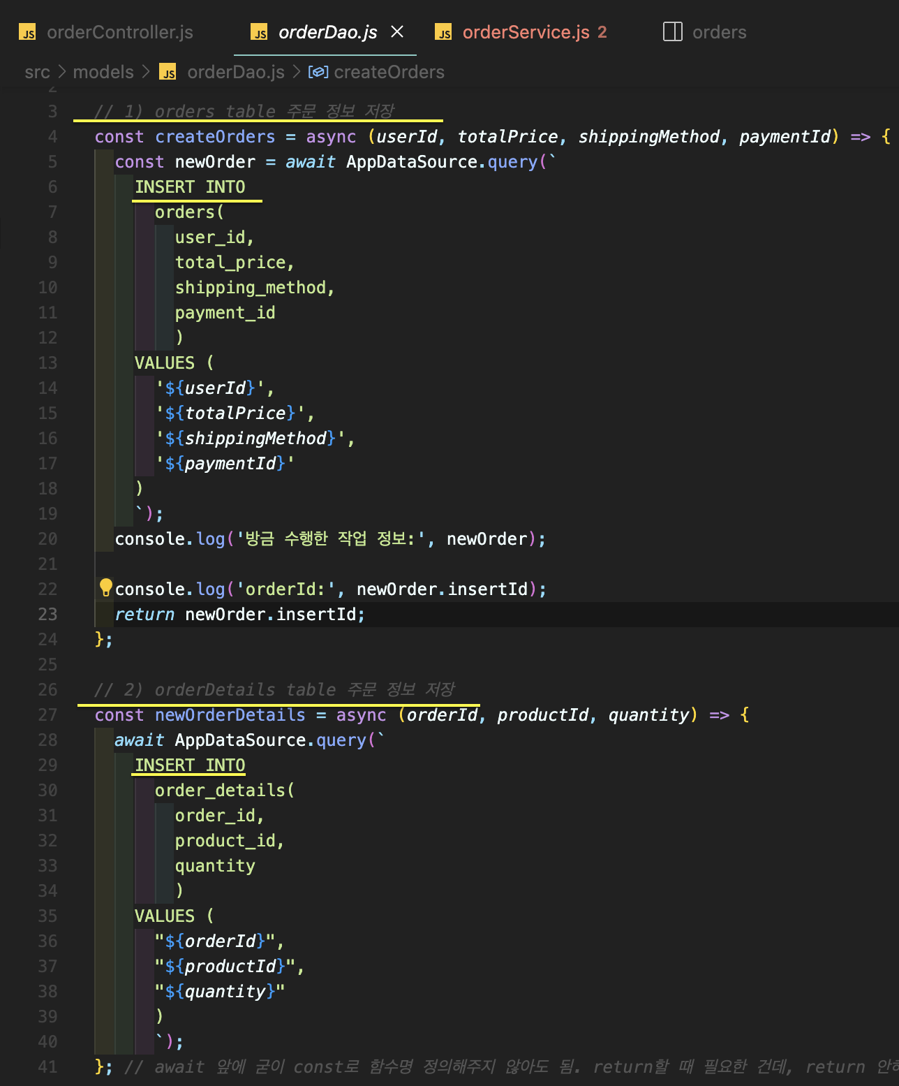 orders 테이블은 이만큼이나, orderDetails로 주문정보 저장(insert into 쿼리문 오류) 넘어가지 않아서 실패했는데도,