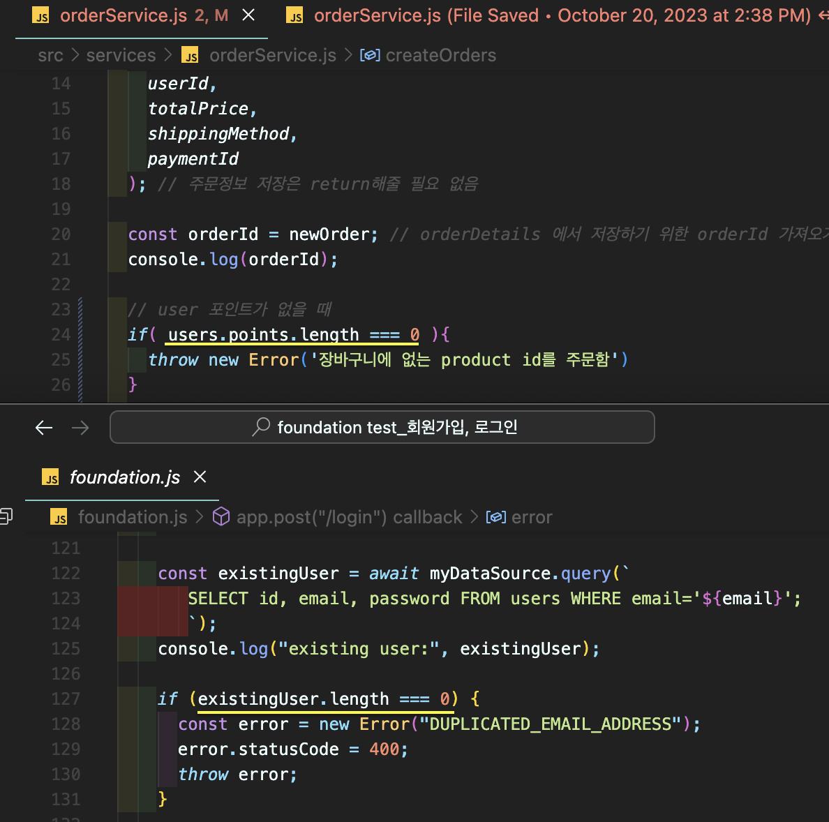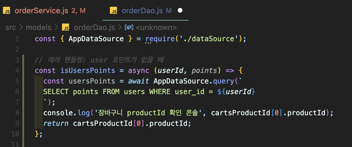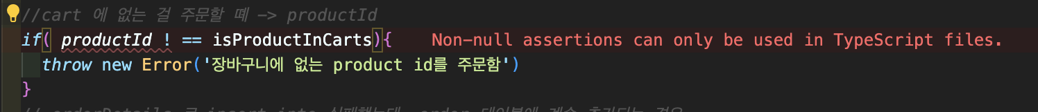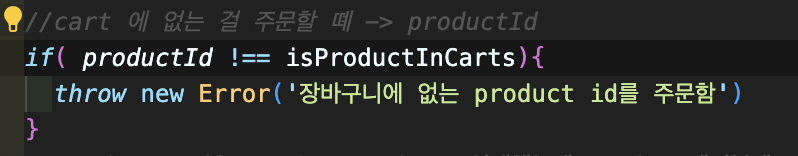 3가지 에러 1. // 에러 핸들링: carts 에 담기지 않은 product를 주문할 때 -> productId 라서 for()안에 들어가야 함 const isProductInCarts = await orderDao.isProductInCarts(userId, productId); // await: userId, productId,(orderDetai