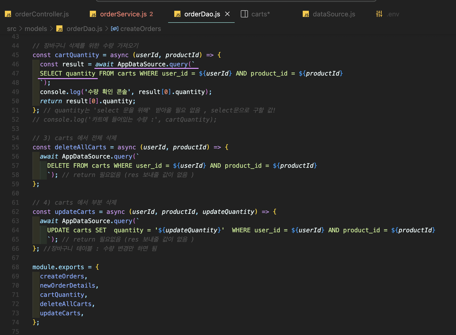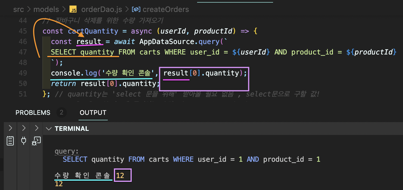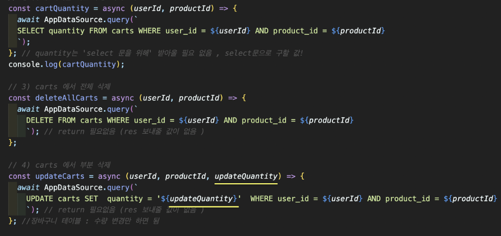 const result = AppDataSource에 모든 테이블들이 있는데, 거기에서 carts 테이블의 quantity를 뽑아온 것!