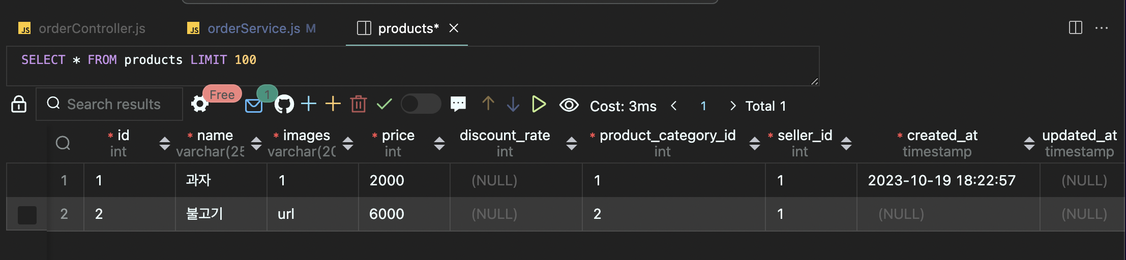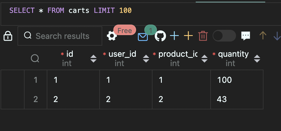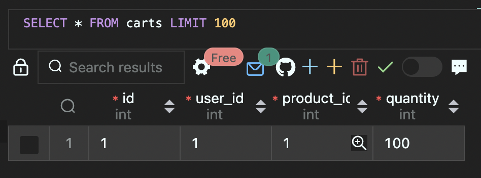 vscode의 mysql 확장자 사용 -> 주문 결제 시 간편 1. carts 수량 넉넉히 넣어두고 (테스트 해야 하니까) ( + 버튼 누르면 됨) 2. user 만들고 (created at dms 자동생성되니 냅두고) 3. product 만들고 (아래에 produ