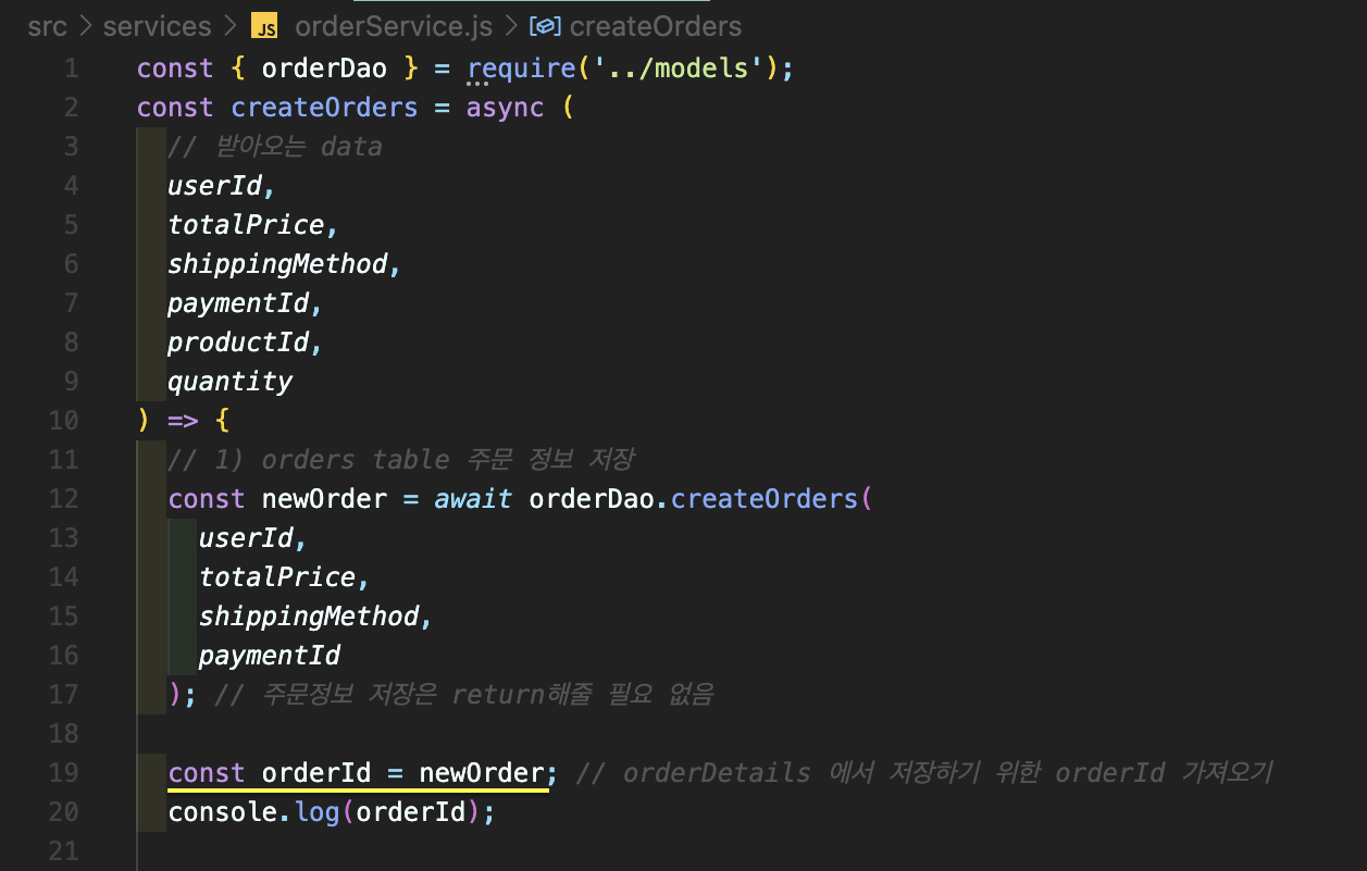 return으로 orderService.js 에 보내준다.