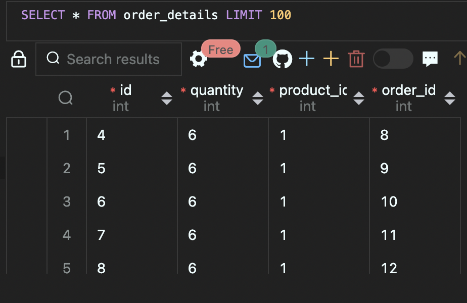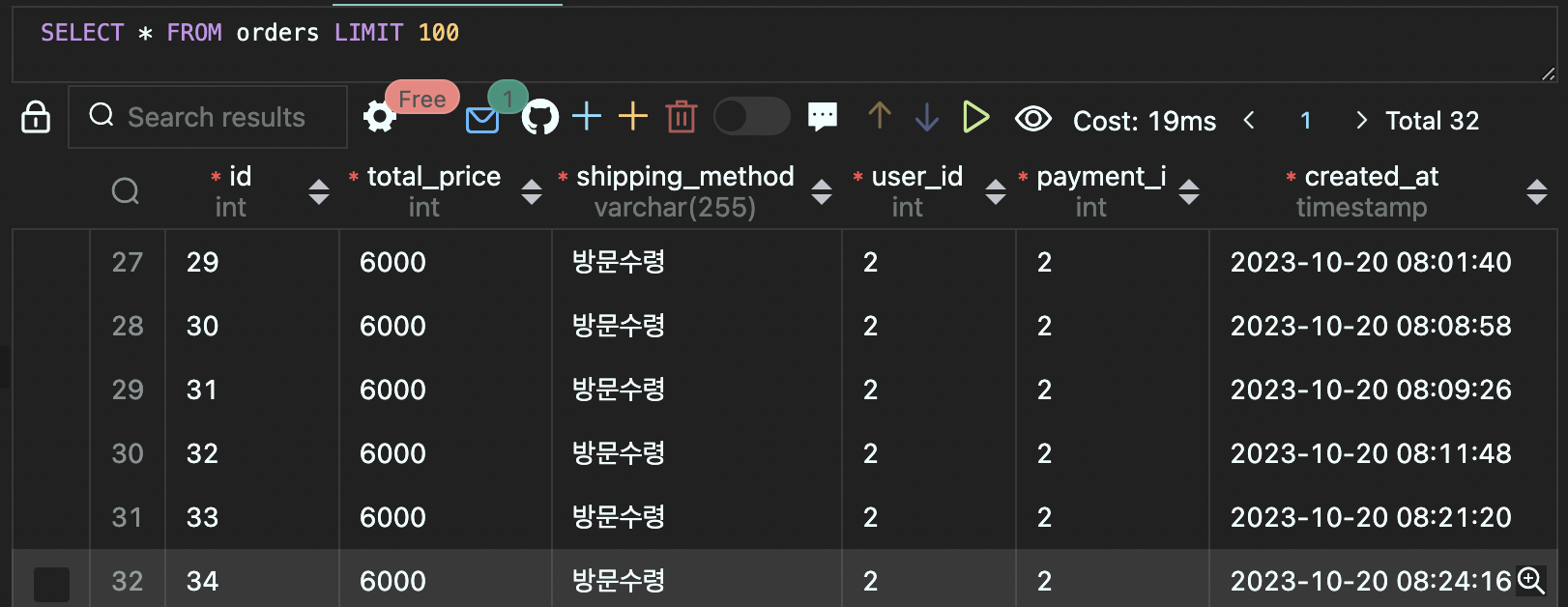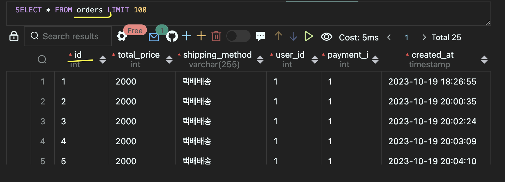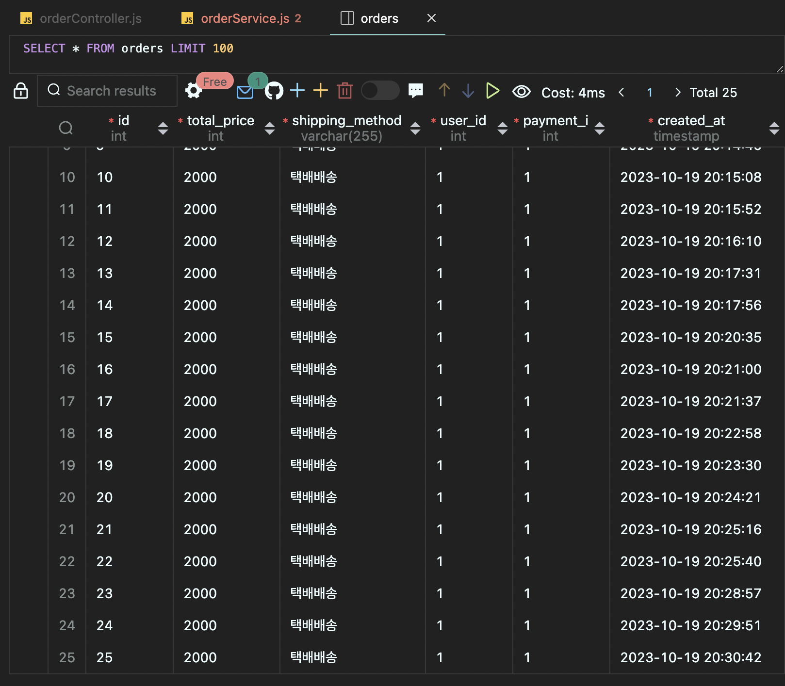 orders 테이블은 이만큼이나, orderDetails로 주문정보 저장(insert into 쿼리문 오류) 넘어가지 않아서 실패했는데도,