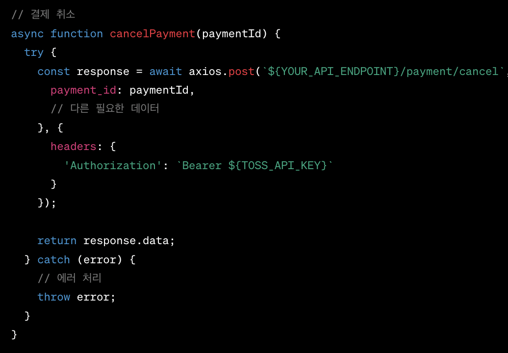 예를 들어, axios나 node-fetch와 같은 HTTP 클라이언트를 사용하여 Toss API 엔드포인트에 요청을 보낼 수 있습니다.
