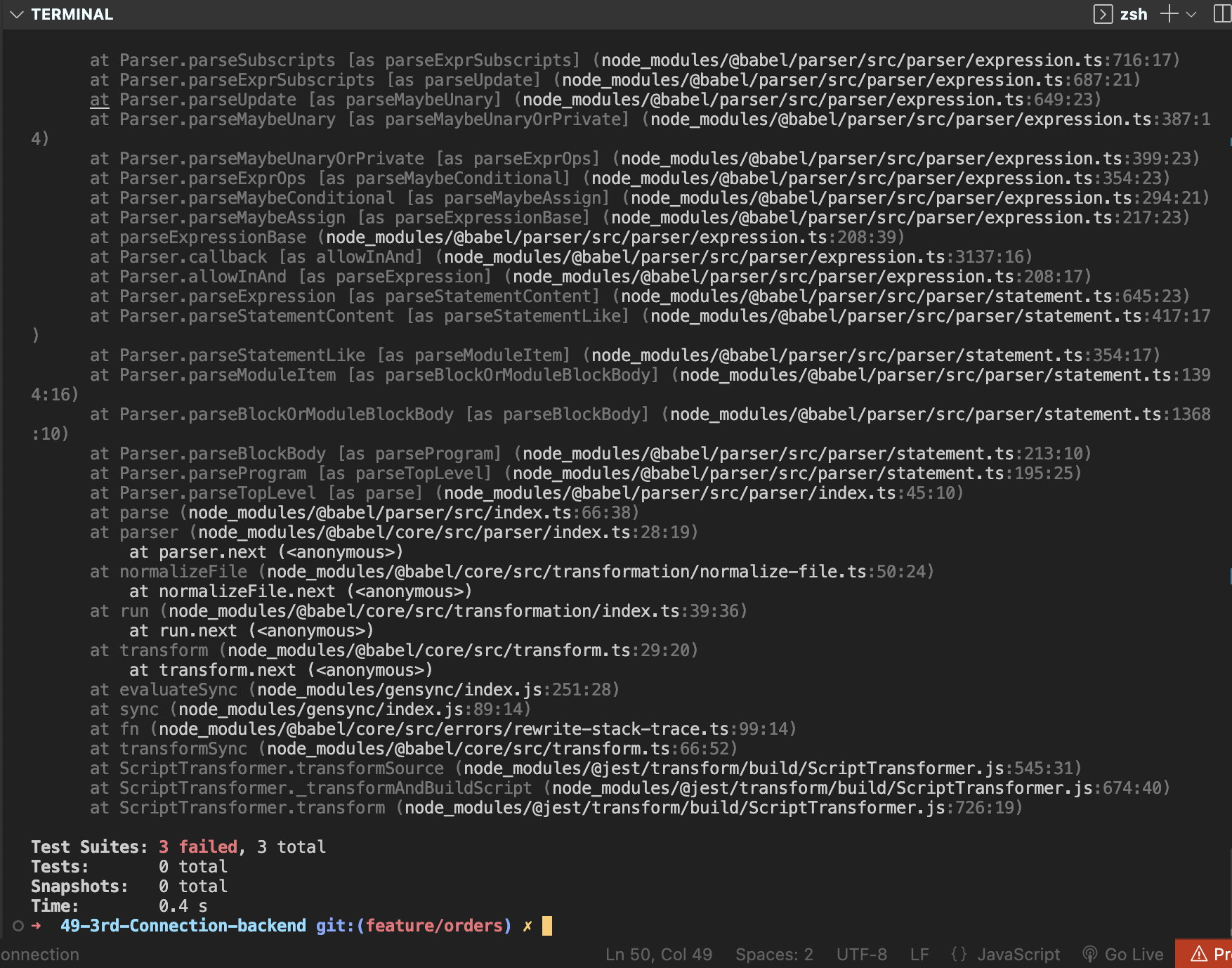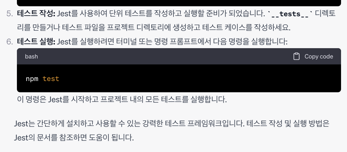 - test code 실행을 위해서는, npm test --> 에러가 안 날 때까지 하는 거
