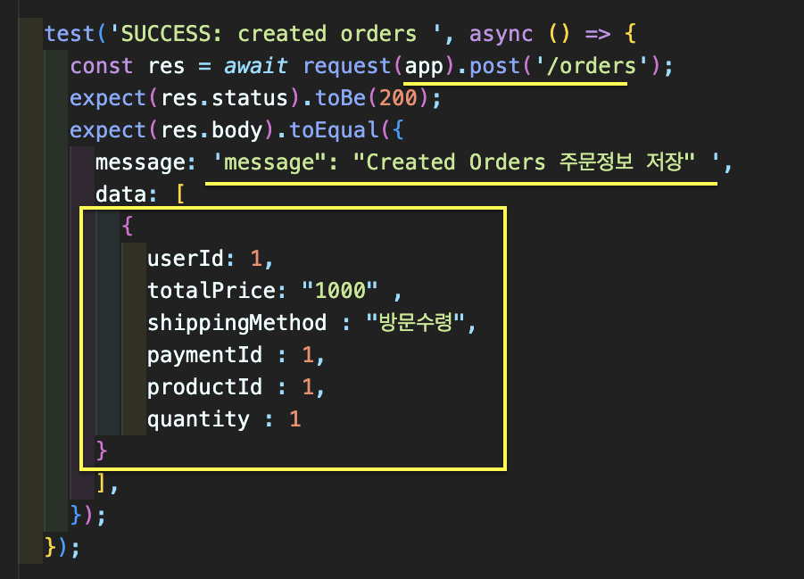 4. message에는 postman에 찍히는 res 값 “message": "Created Orders 주문정보 저장”