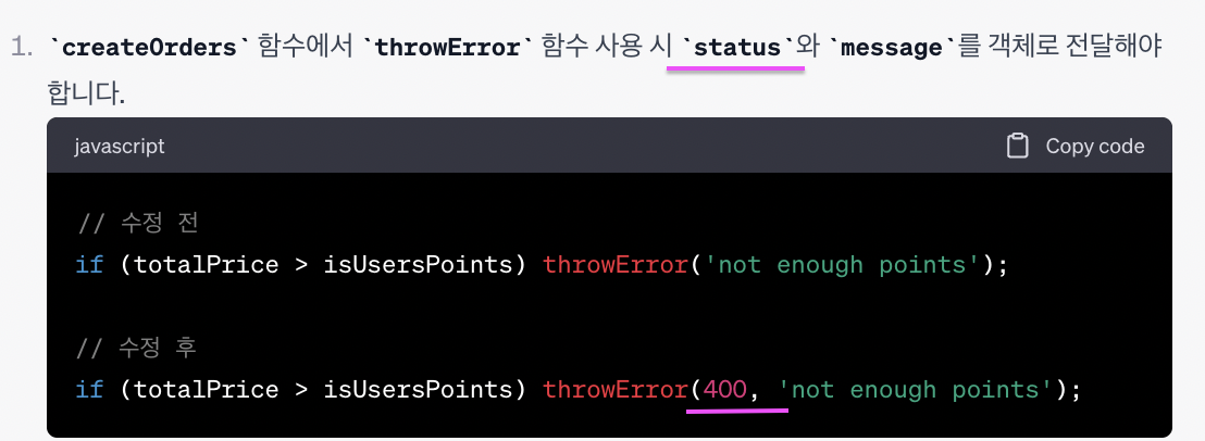 // 에러 핸들링: order.totalPrice > user : 포인트가 부족할 때 ( 갖고 있는 point보다 비싼 걸 살 때) if (totalPrice > isUsersPoints) { throw new Error('not enough points'); }