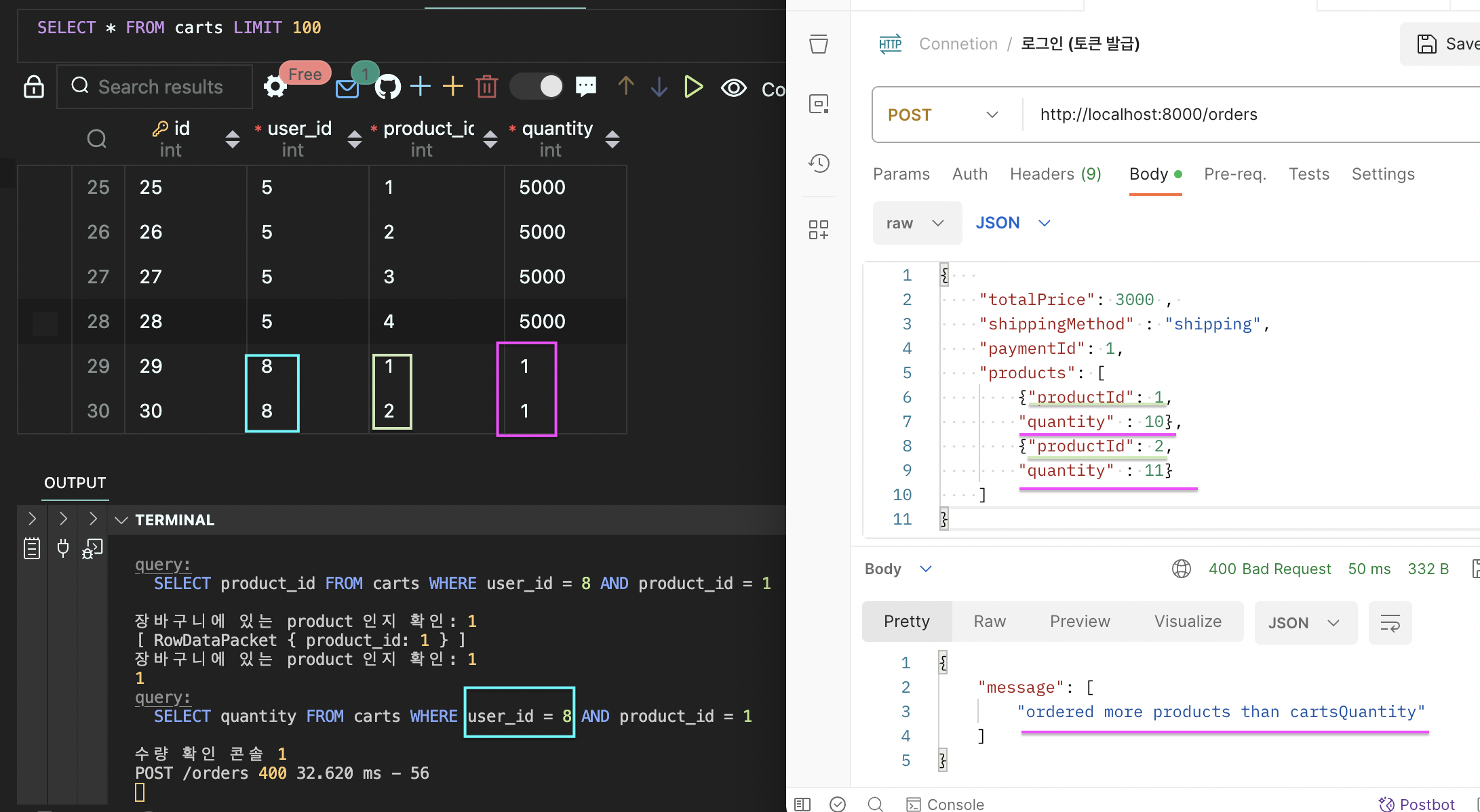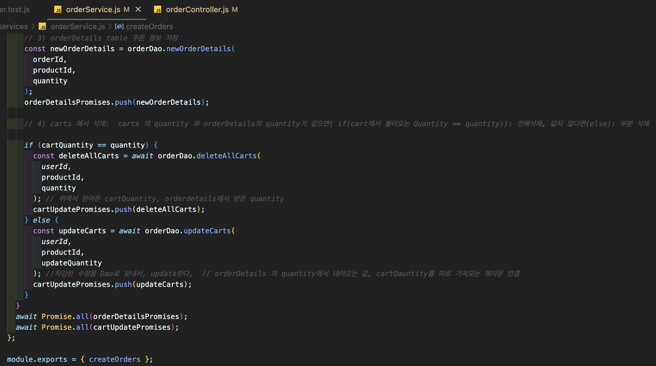 2. // 에러 핸들링 : carts에 담은 수량 < 주문한 수량__ 장바구니 < order 수량 많은 경우 없음_ 장바구니에서 저장 후 넘어가니 if (cartQuantity < quantity) { throw new Error('ordered more products than cartsQuantity'); }