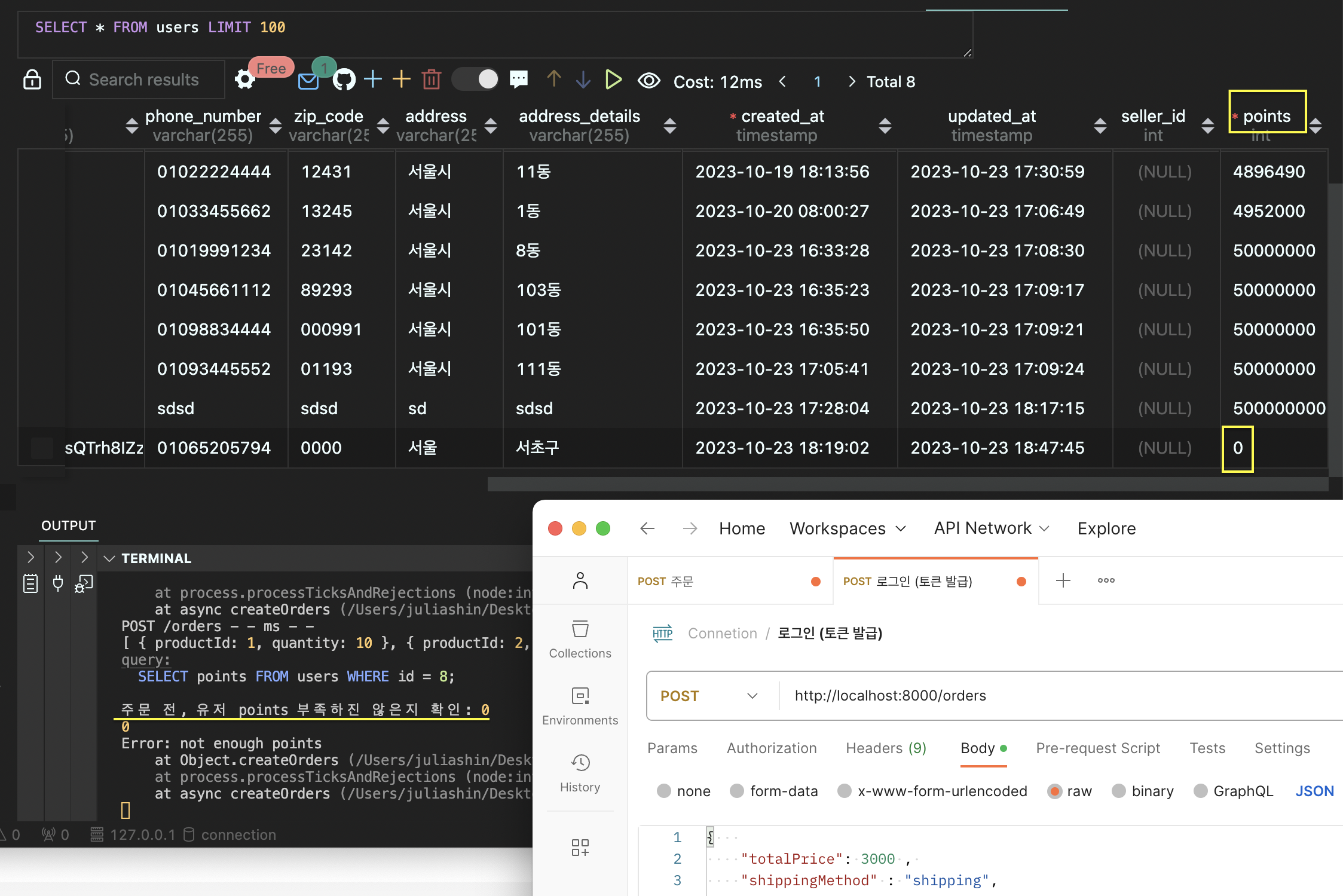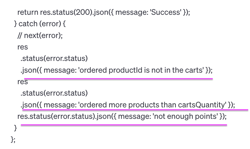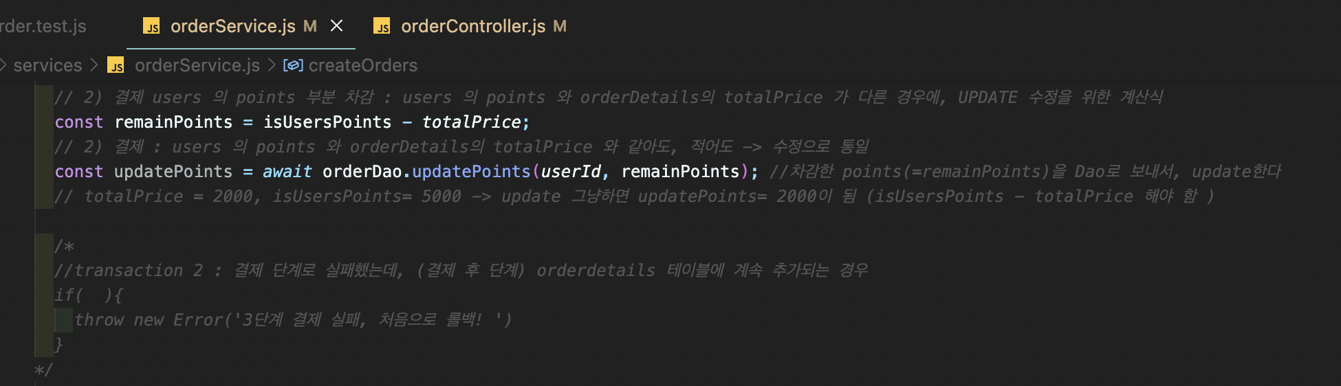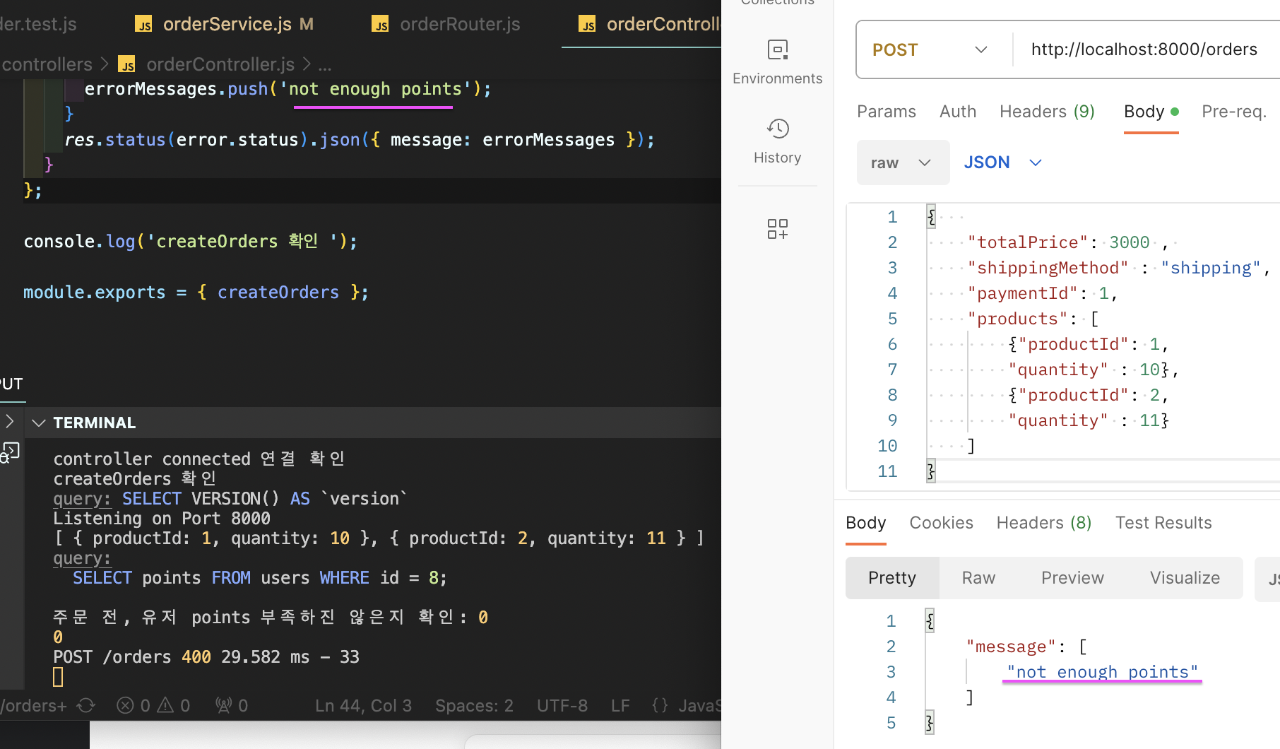 // 에러 핸들링: order.totalPrice > user : 포인트가 부족할 때 ( 갖고 있는 point보다 비싼 걸 살 때) if (totalPrice > isUsersPoints) { throw new Error('not enough points'); }
