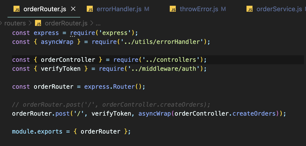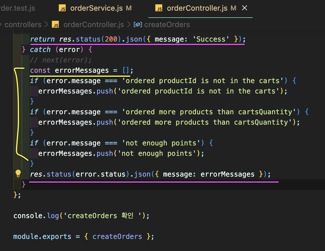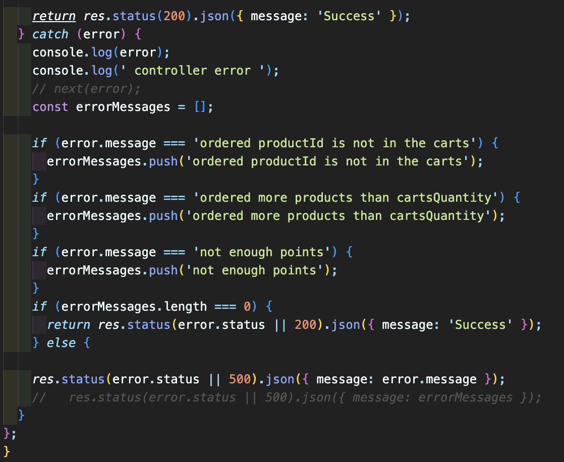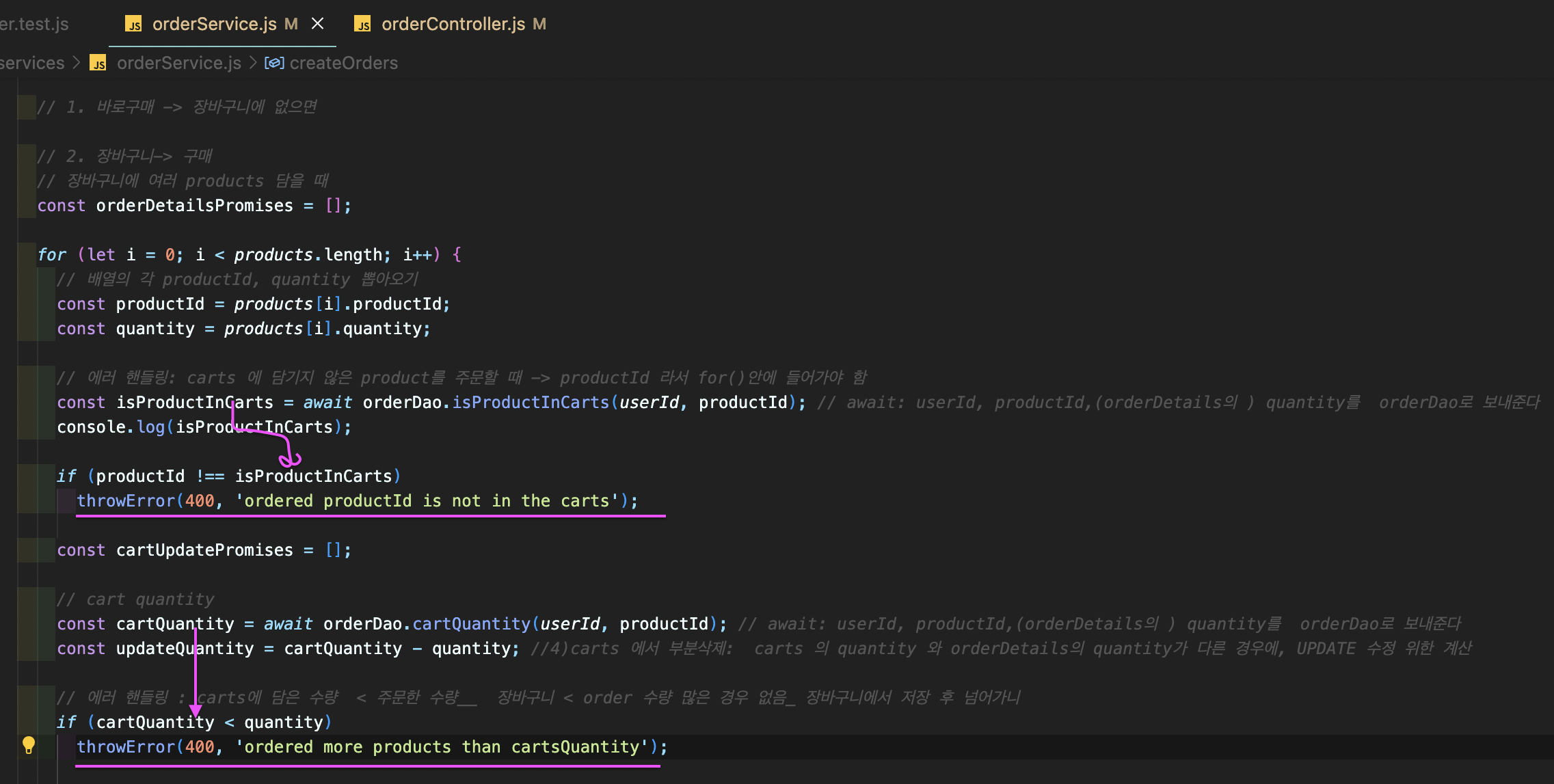 2. // 에러 핸들링 : carts에 담은 수량 < 주문한 수량__ 장바구니 < order 수량 많은 경우 없음_ 장바구니에서 저장 후 넘어가니 if (cartQuantity < quantity) { throw new Error('ordered more products than cartsQuantity'); }