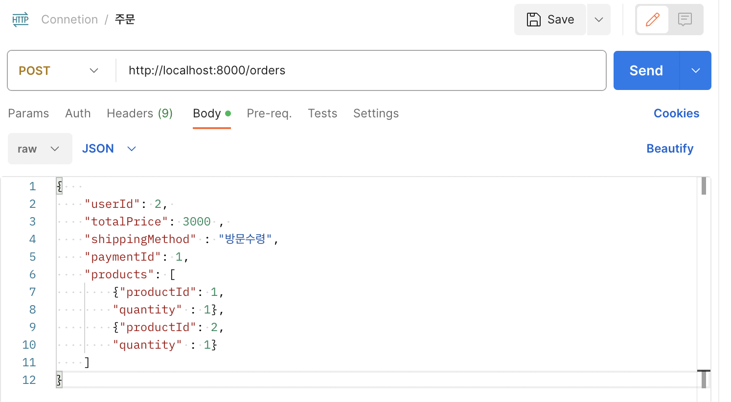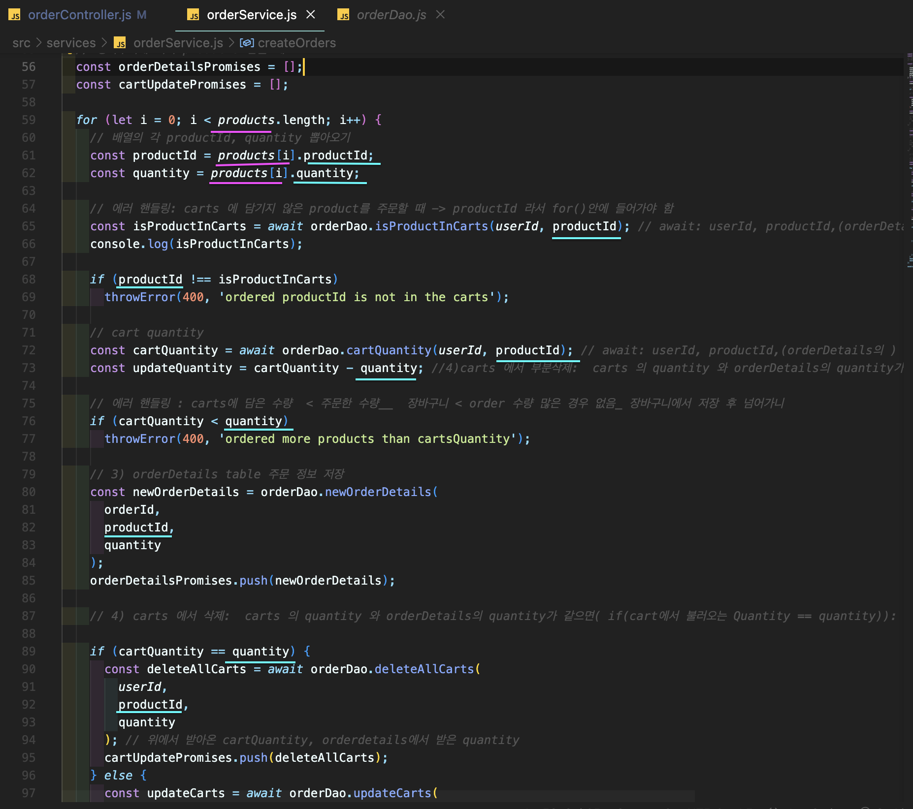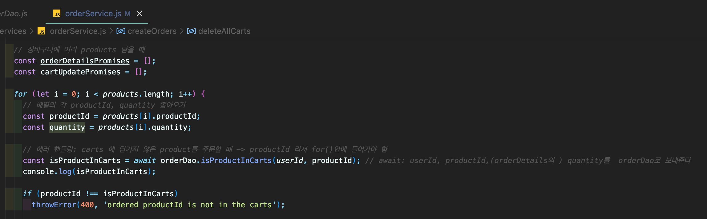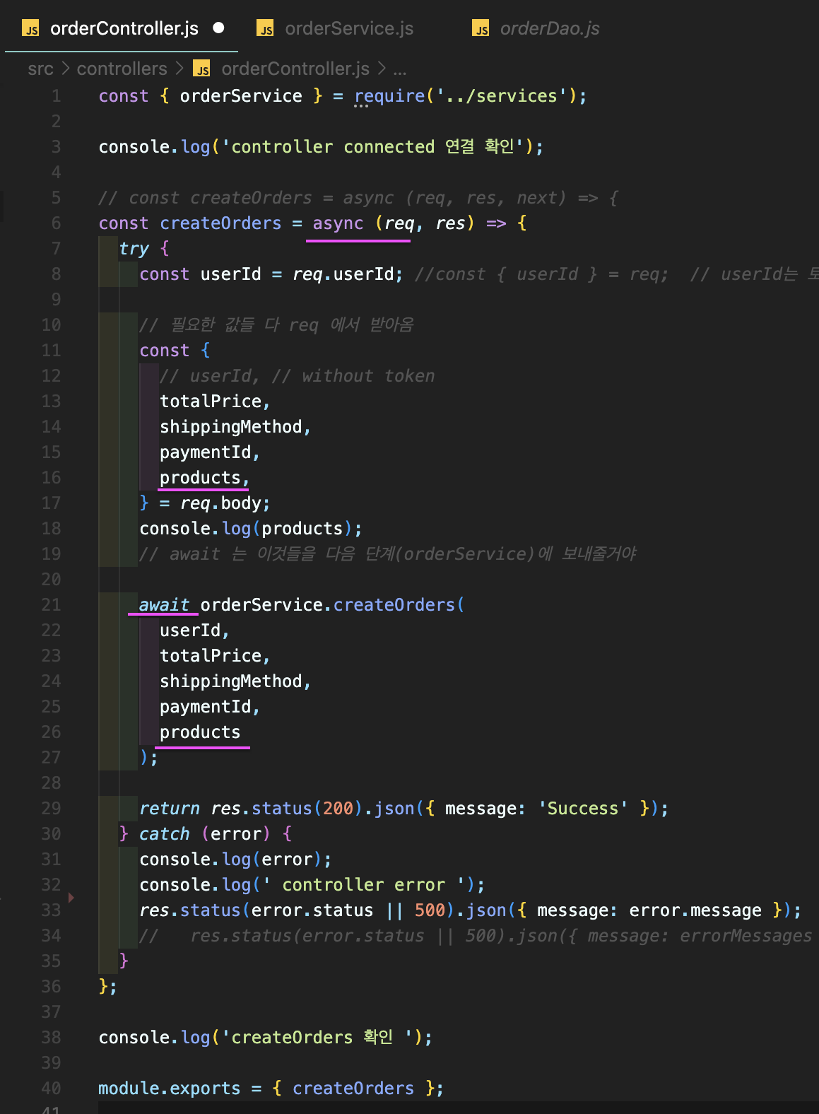 orderController는 req,res를 다루는 곳이니, body에 적힌 products를 받아야 한다
