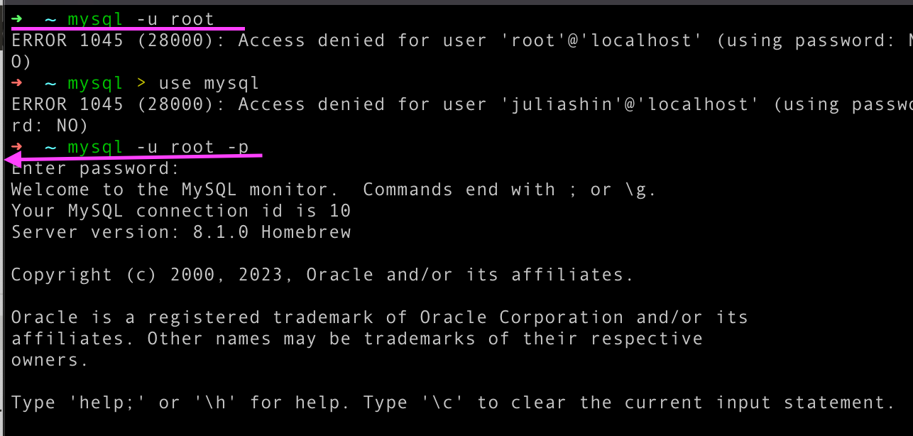 mysql -u root -p (로그인 과정, p는 password를 쳐라)