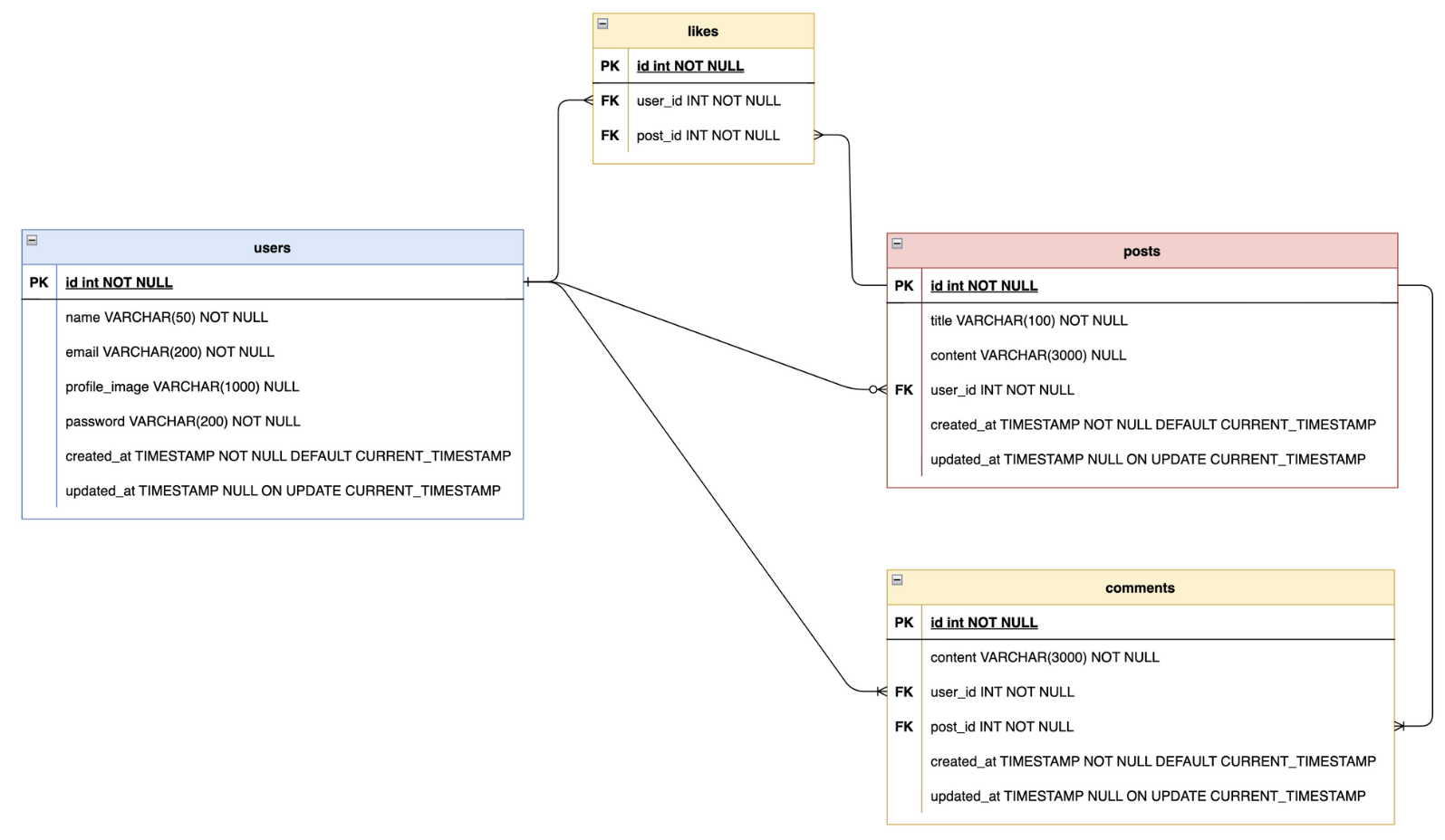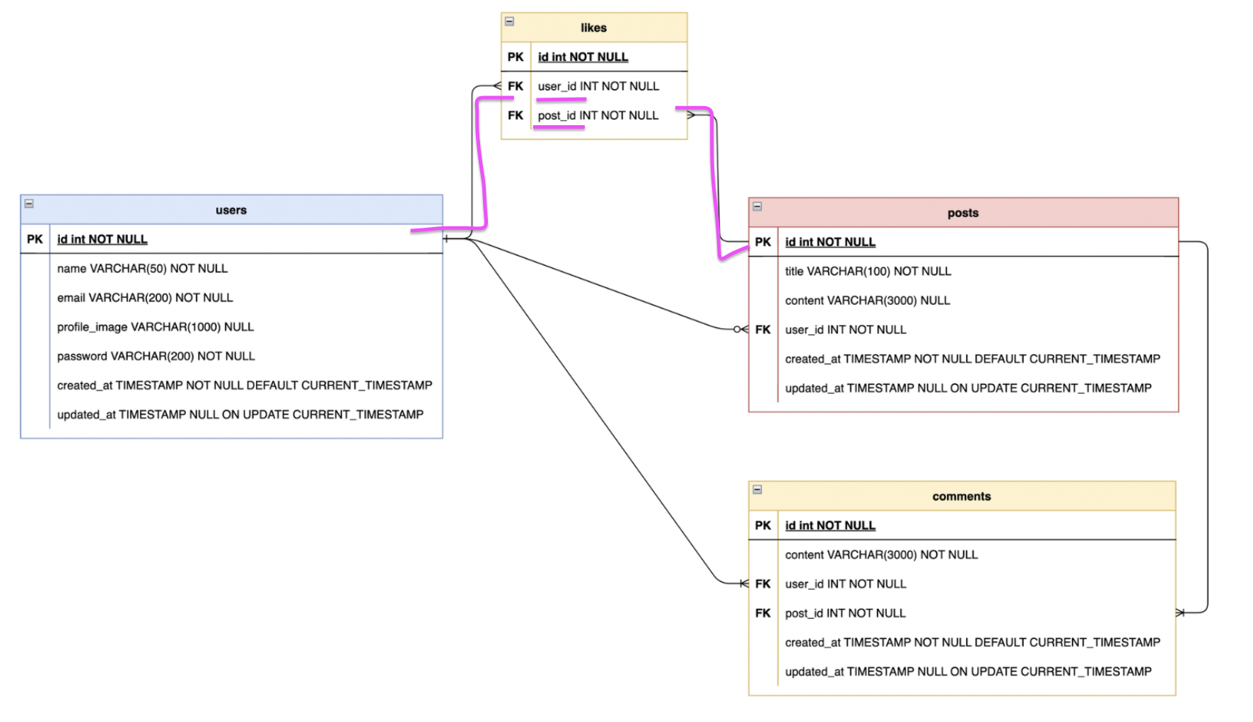 과제 1. 아래 제공된 ERD(Entity Relational Diagram)를 참고하여 MySQL Server 내에 “westagram” 이름의 스키마를 생성한 후에, DDL을 사용하여 “westagram” 스키마 내에 users, posts, comments, likes 테이블 객체를 구현합니다.