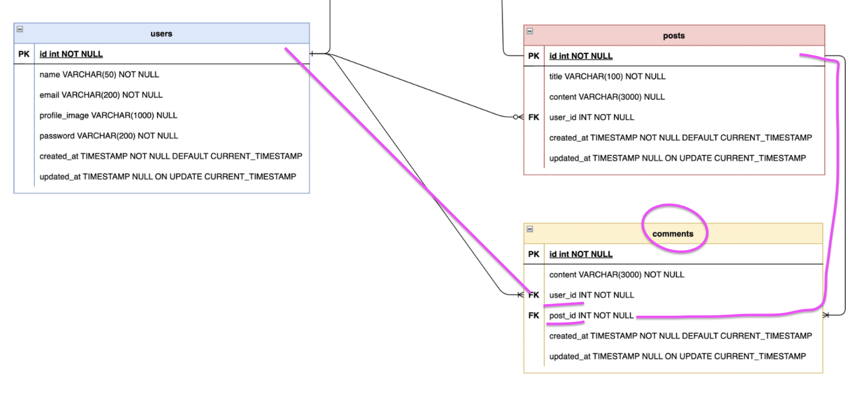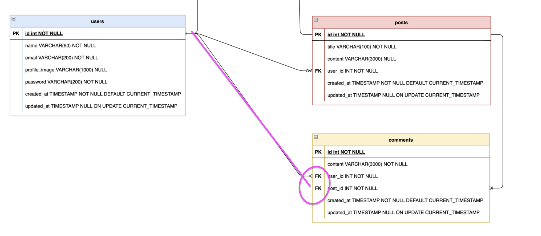 -> FOREIGN KEY (user_id) REFERENCES users(id) #comments 테이블의 primary키 가져오는데, comments 테이블에서 참고해라 맞는지 확인