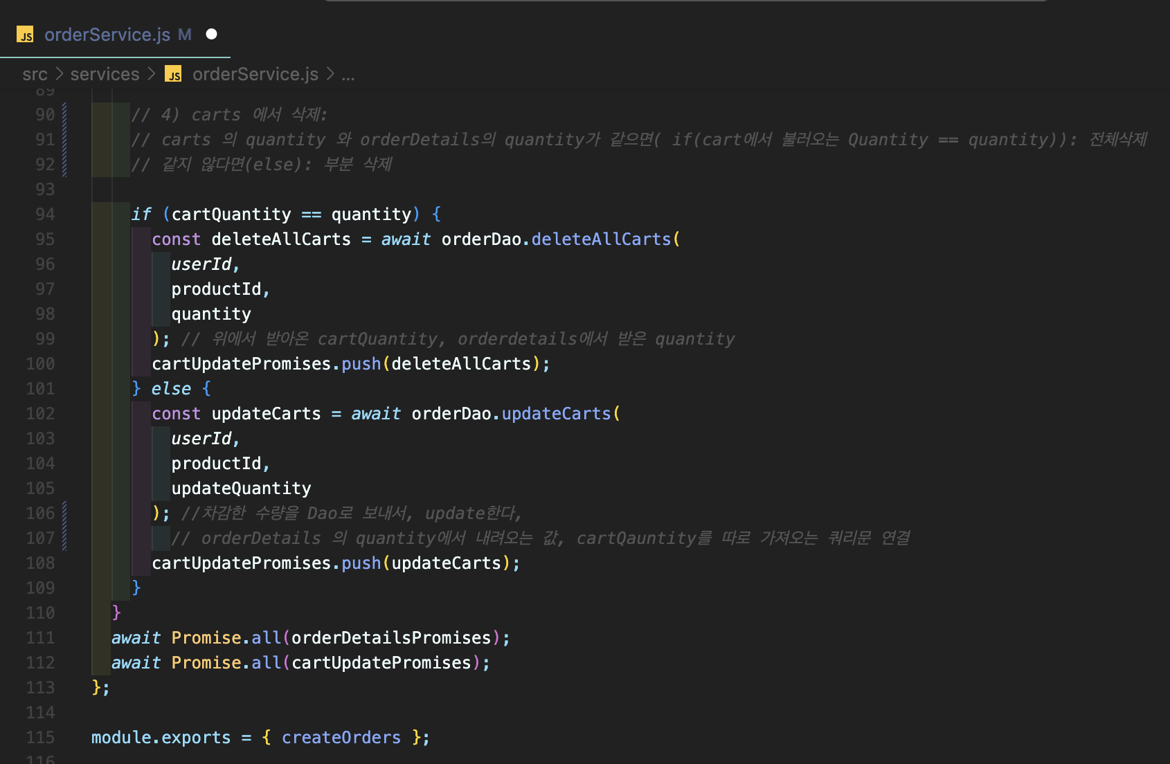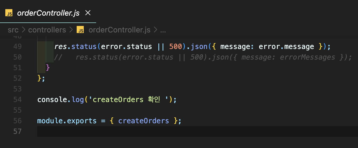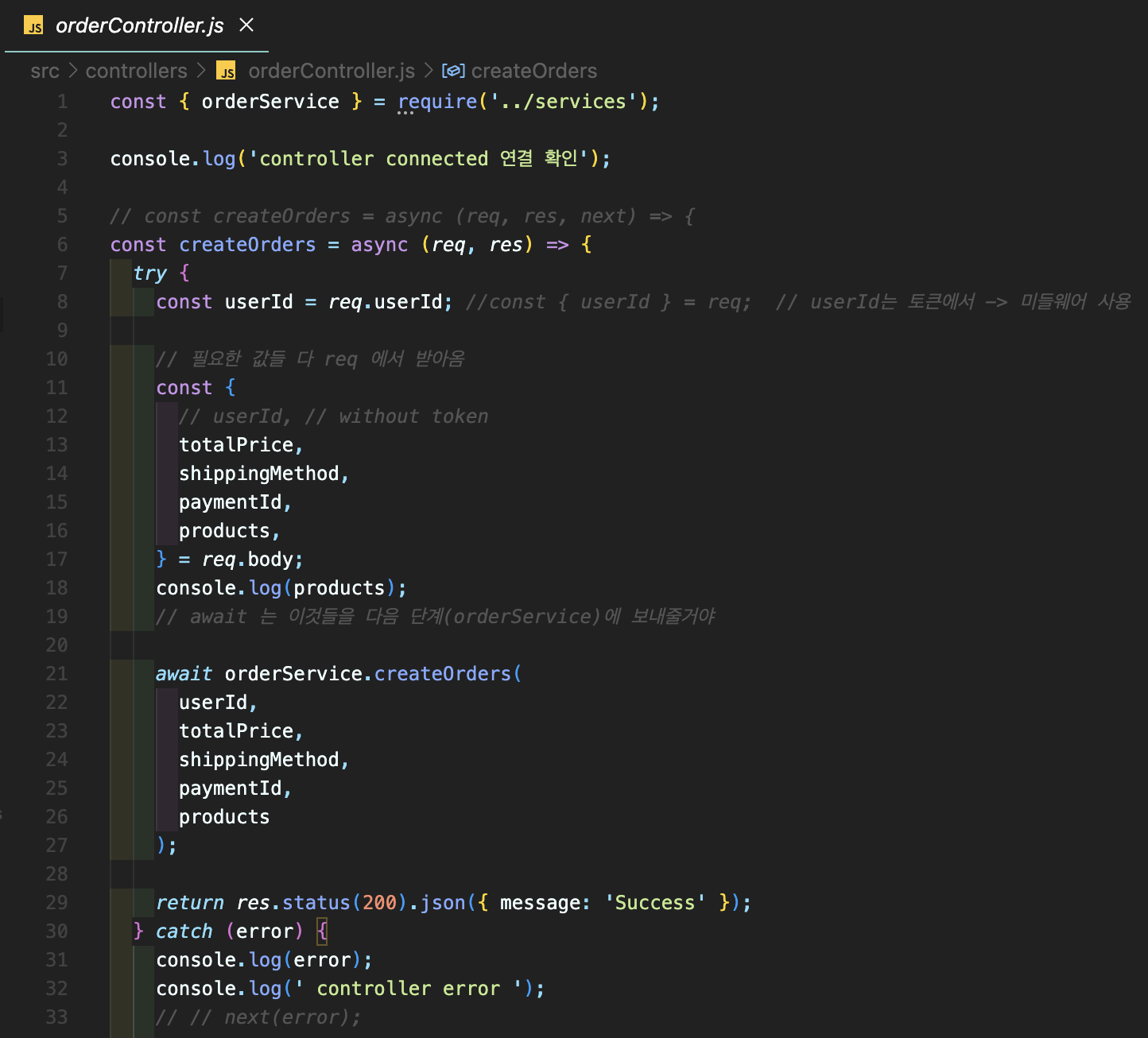 await orderService.createOrders ( ) ; // 이것들을 다음 단계 (orderService)의 createOrders함수 로 보내줄거야.