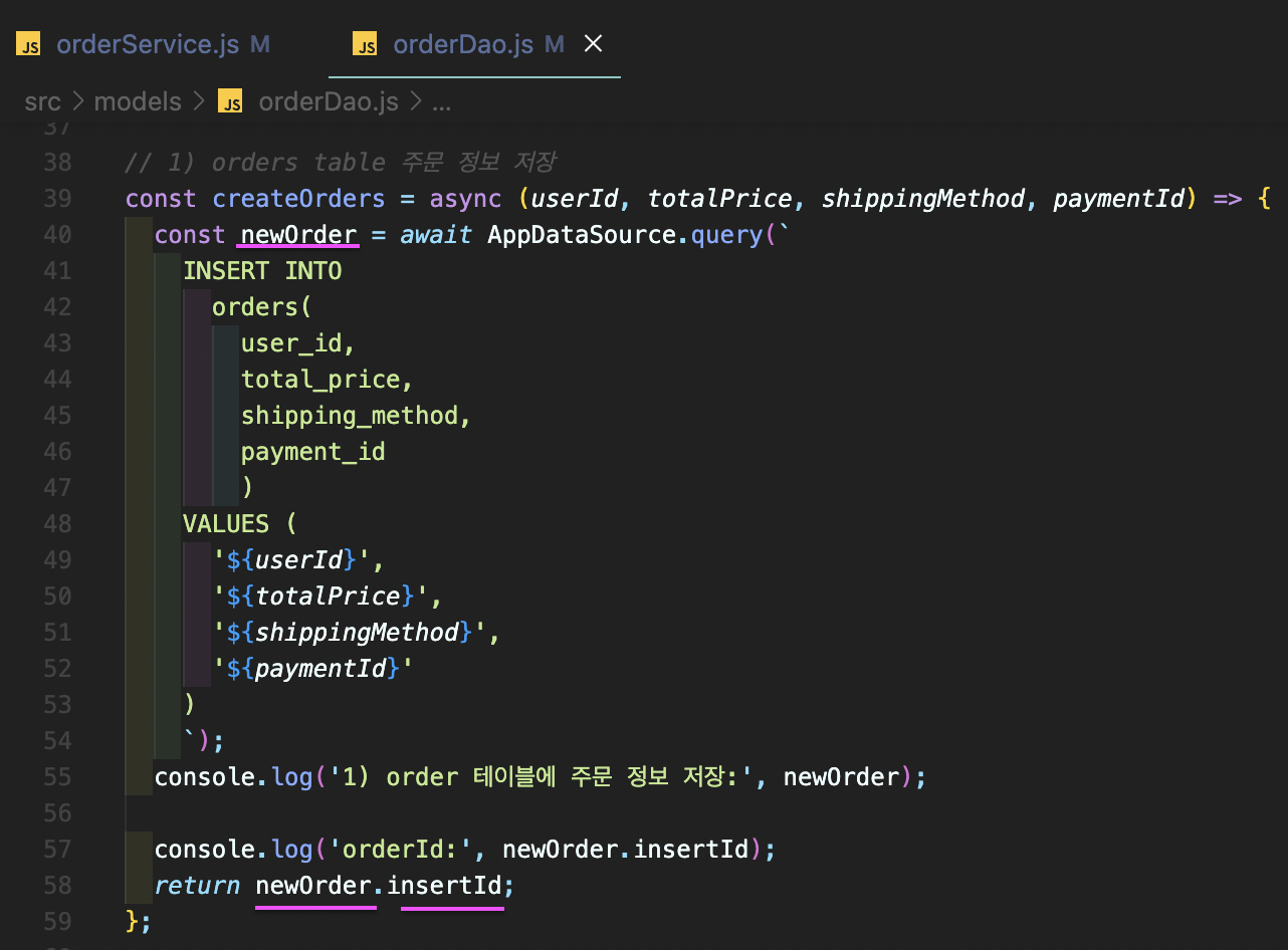 그 newOrder를 찍어보면 insertId가 나오는데,