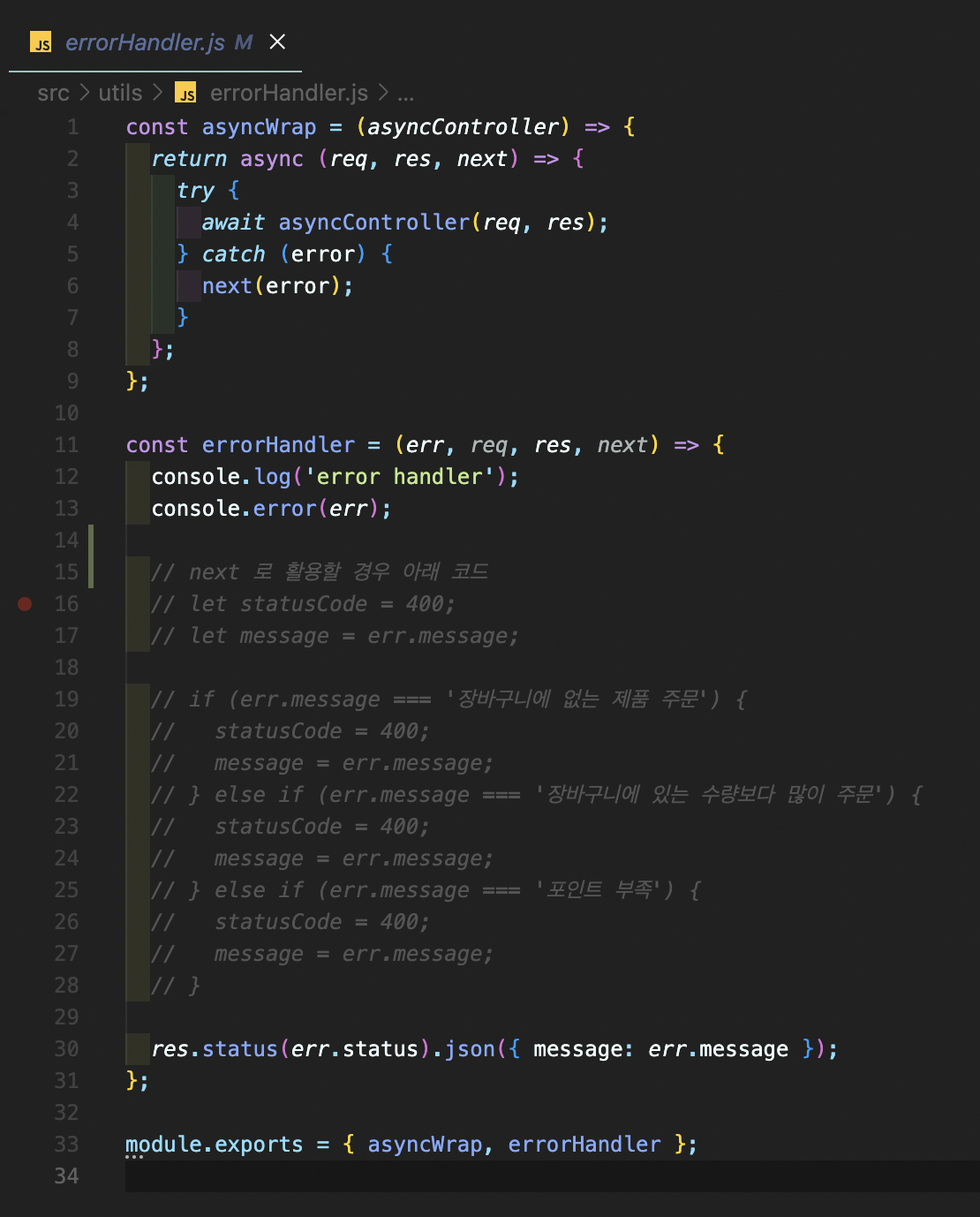 에러 핸들링 w/ [asyncwrap, next, ErrorHandler.js ]