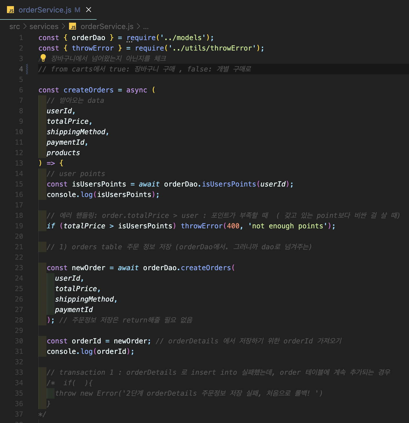 그러기 위해 orderService.js에 있는 userId, remainPoints를
