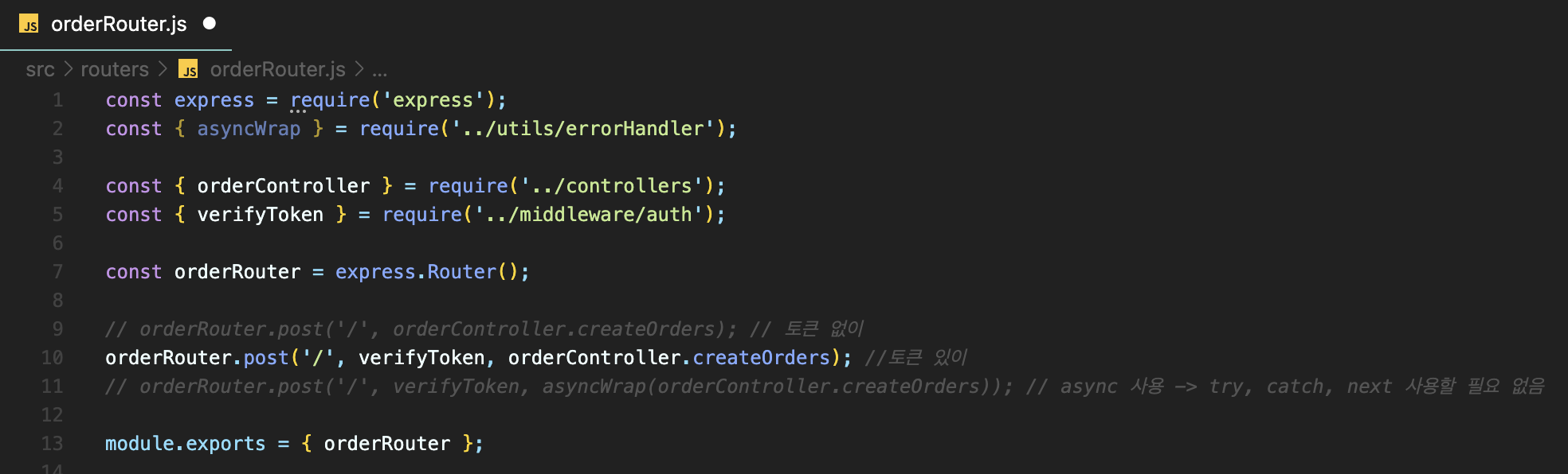 orderRouter.post('/', verifyToken, asyncWrap(orderController.createOrders)); // async 사용 -> try, catch, next 사용할 필요 없음