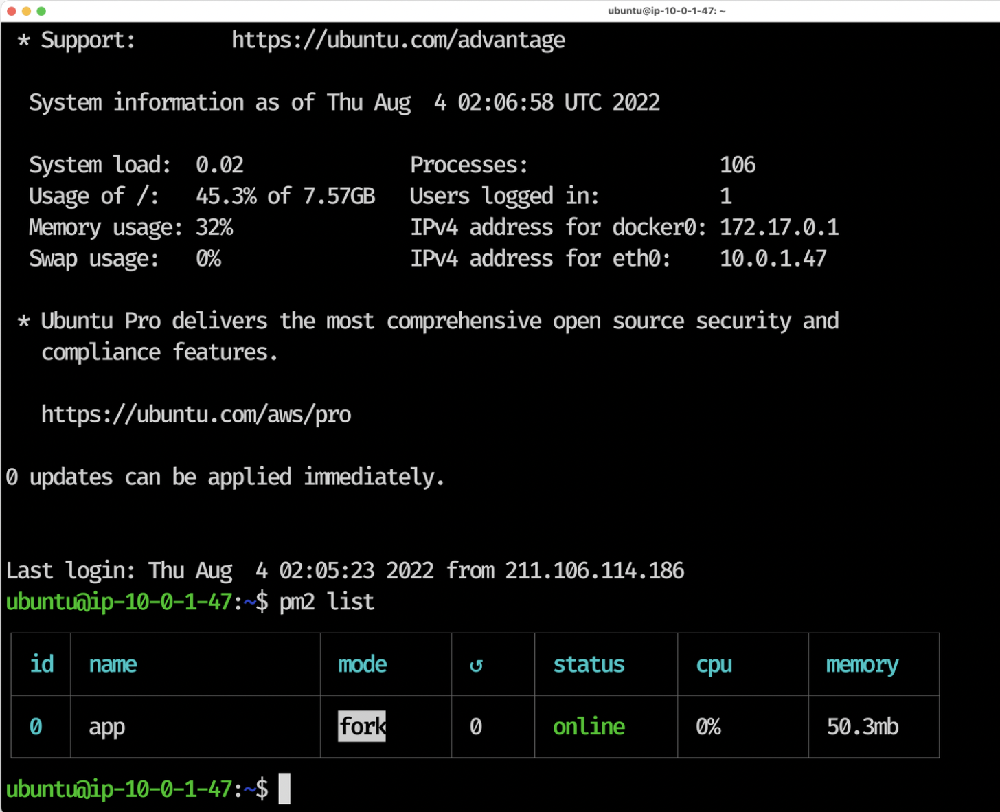 3. pm2 list 명령어 => SSH 세션에서 exit 하고 다시 접속해도 해당 프로세스가 계속해서 동작하는 것을 확인