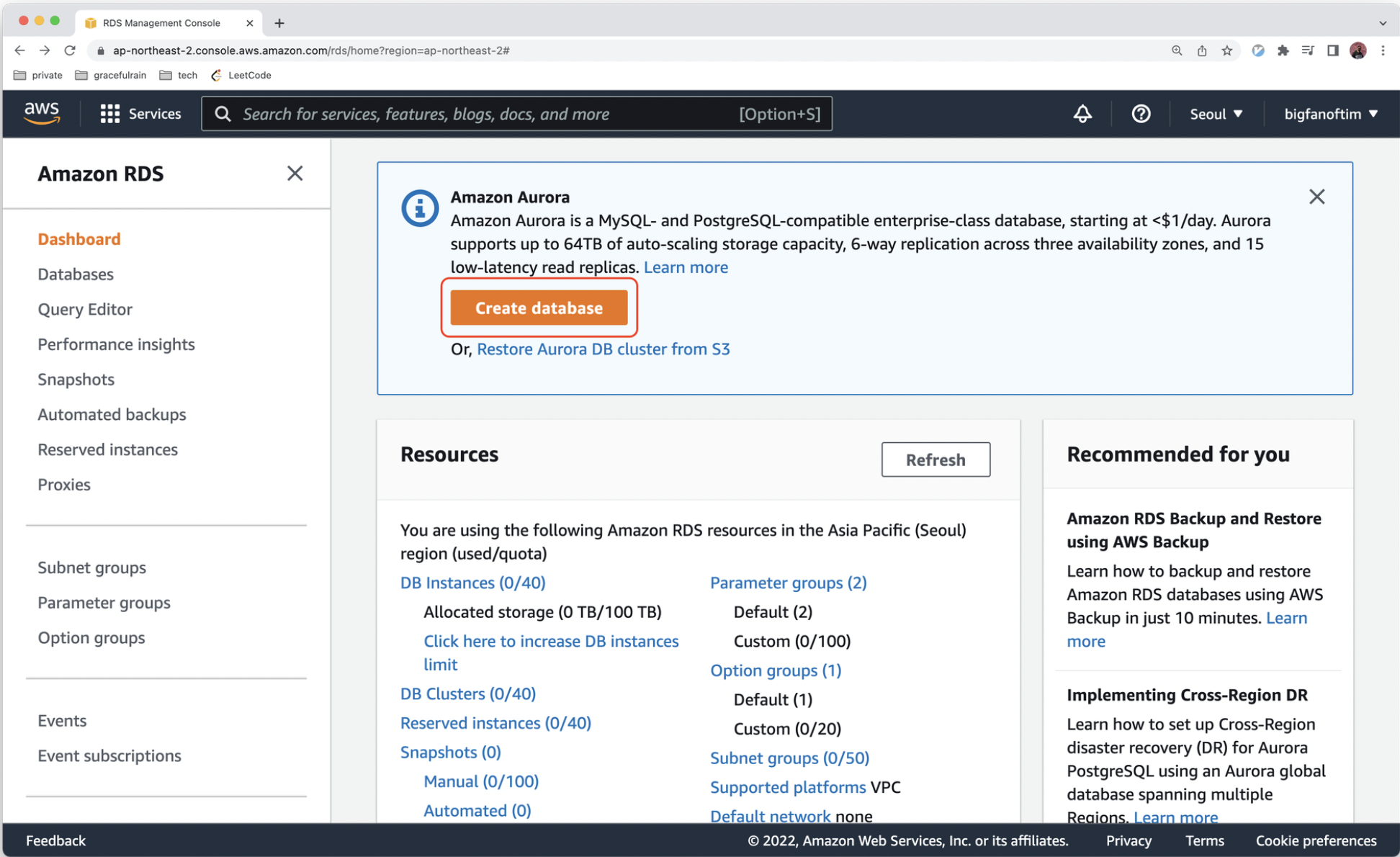1.DB 인스턴스 생성 시작: AWS 로그인 후 RDS 서비스 페이지로 이동하여 Create Database 를 클릭