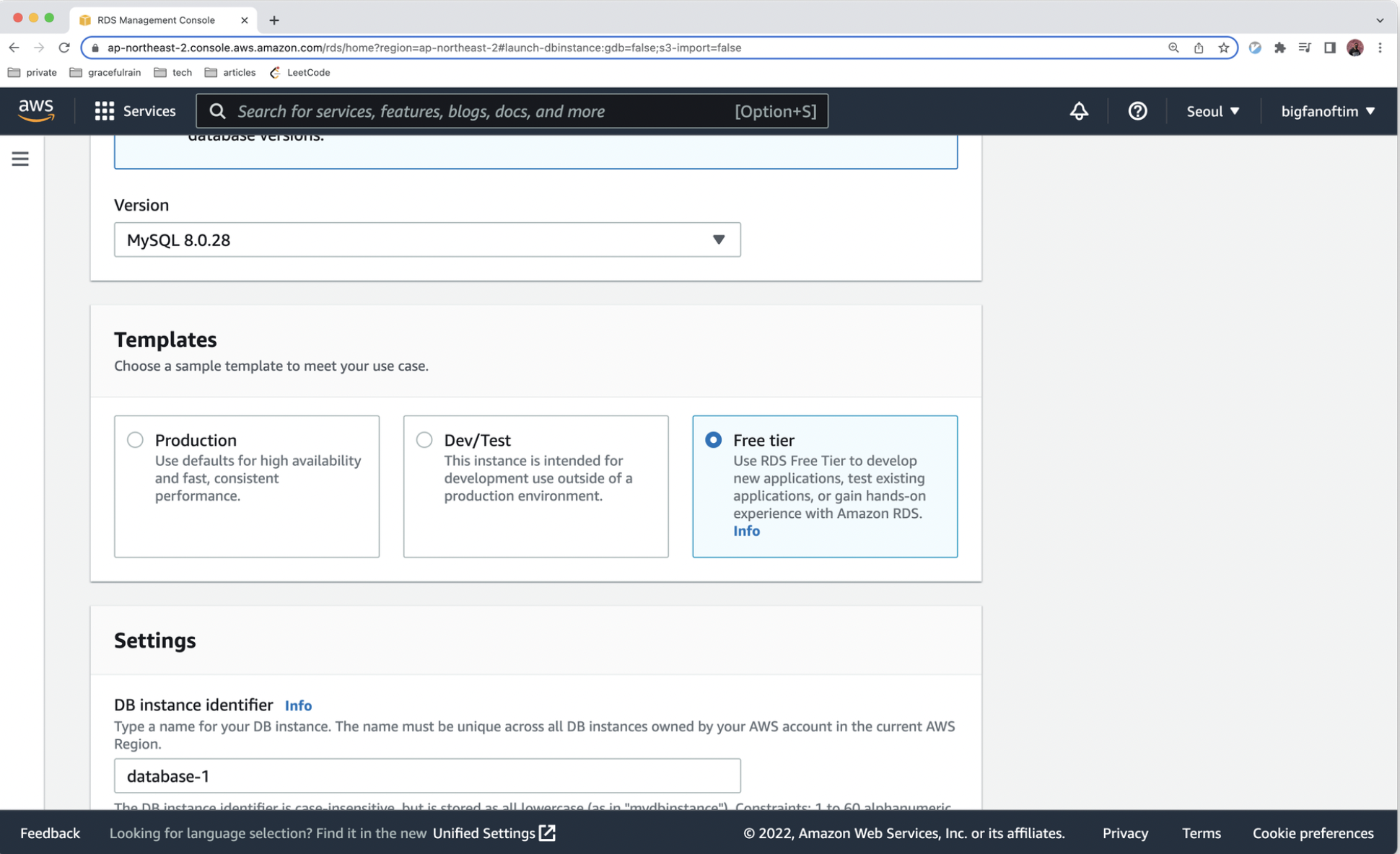 4. 실제 서비스를 운영하는게 아니라면 Free Tier 를 선택해주세요