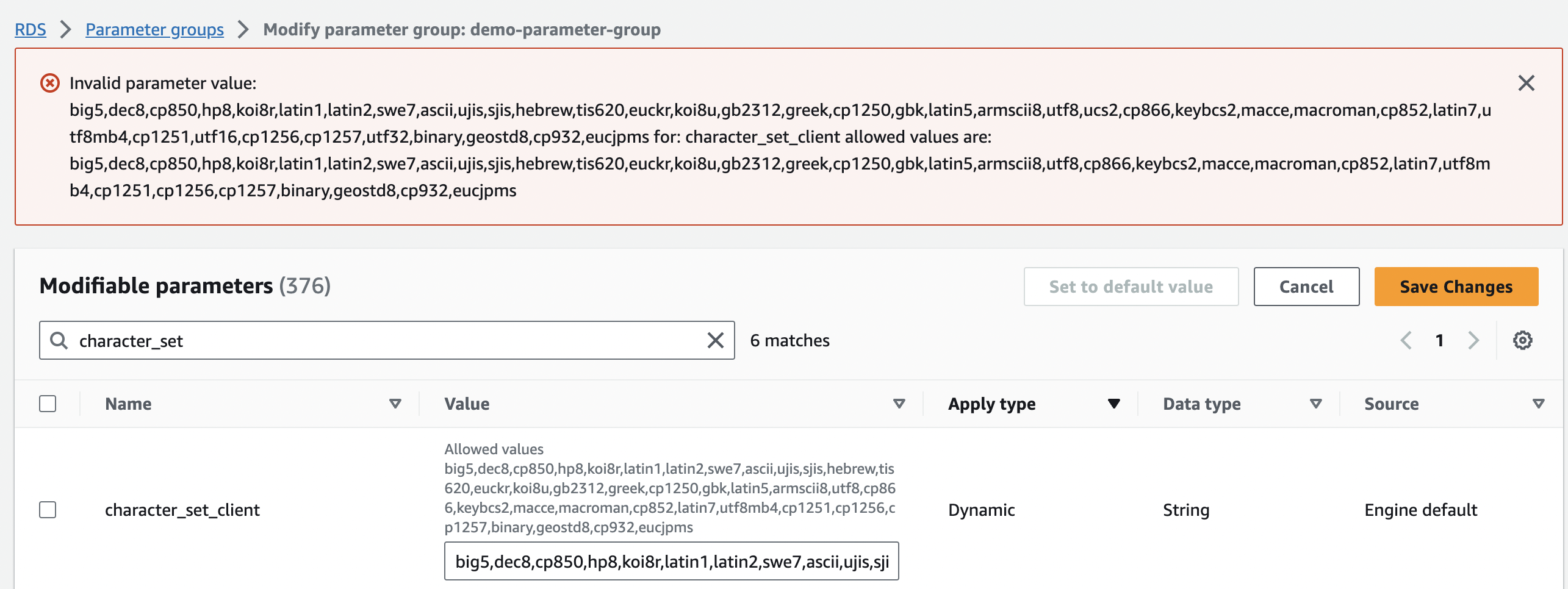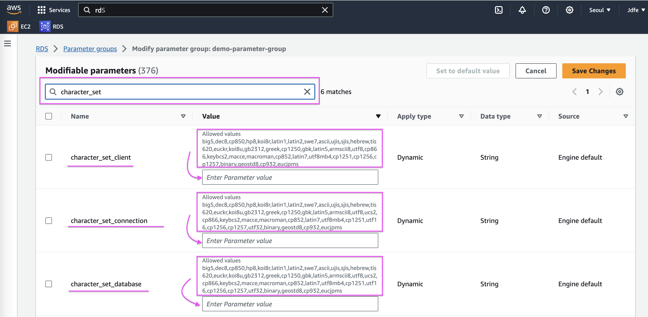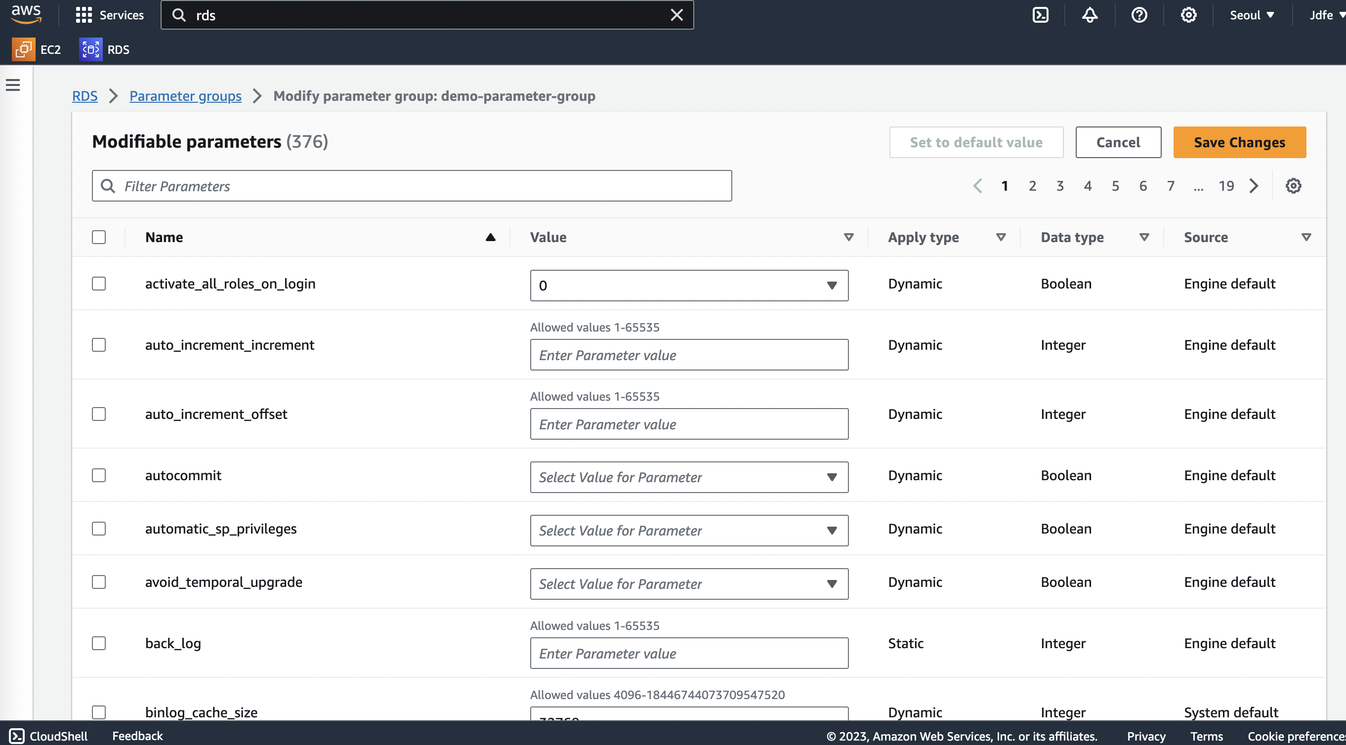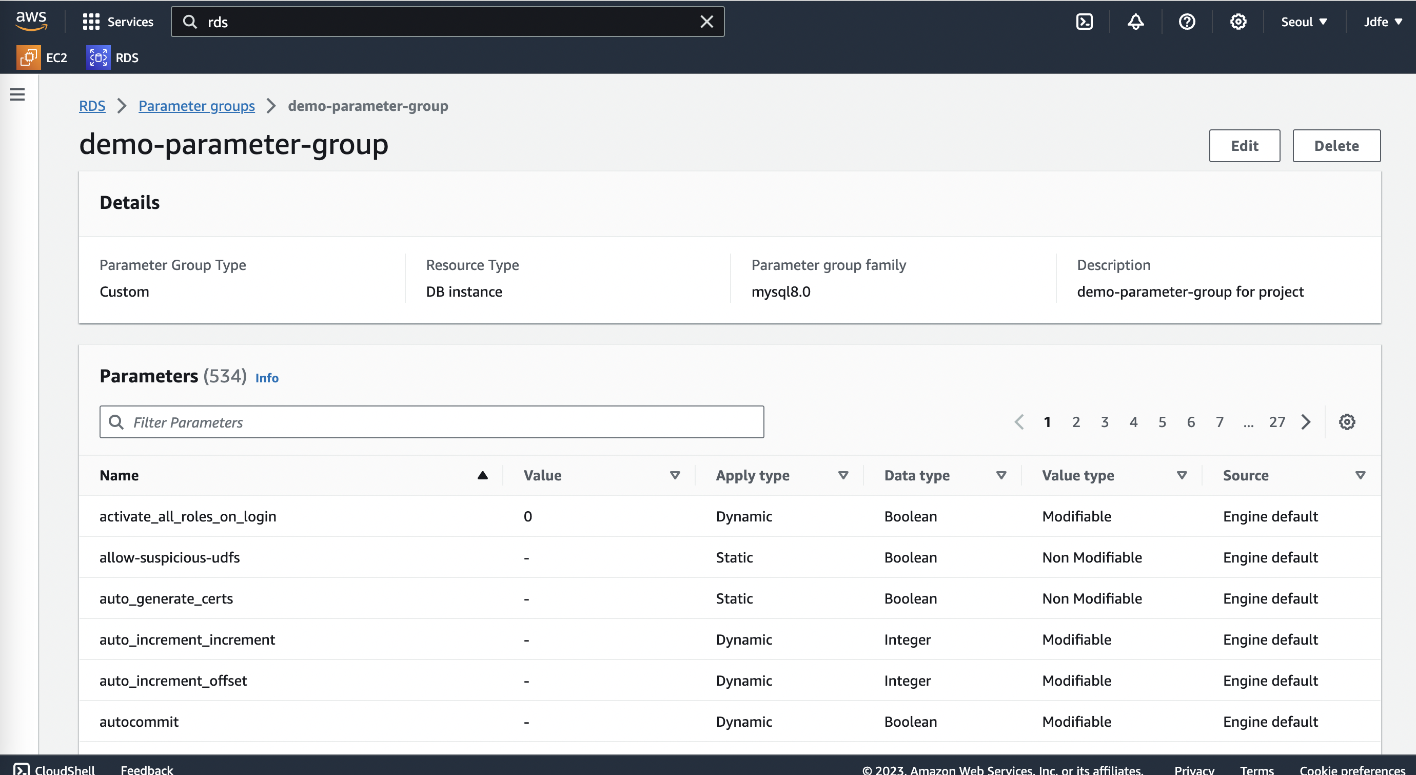 3-2. 생성한 Parameter Group 클릭하면, 아래 페이지로 이동됨