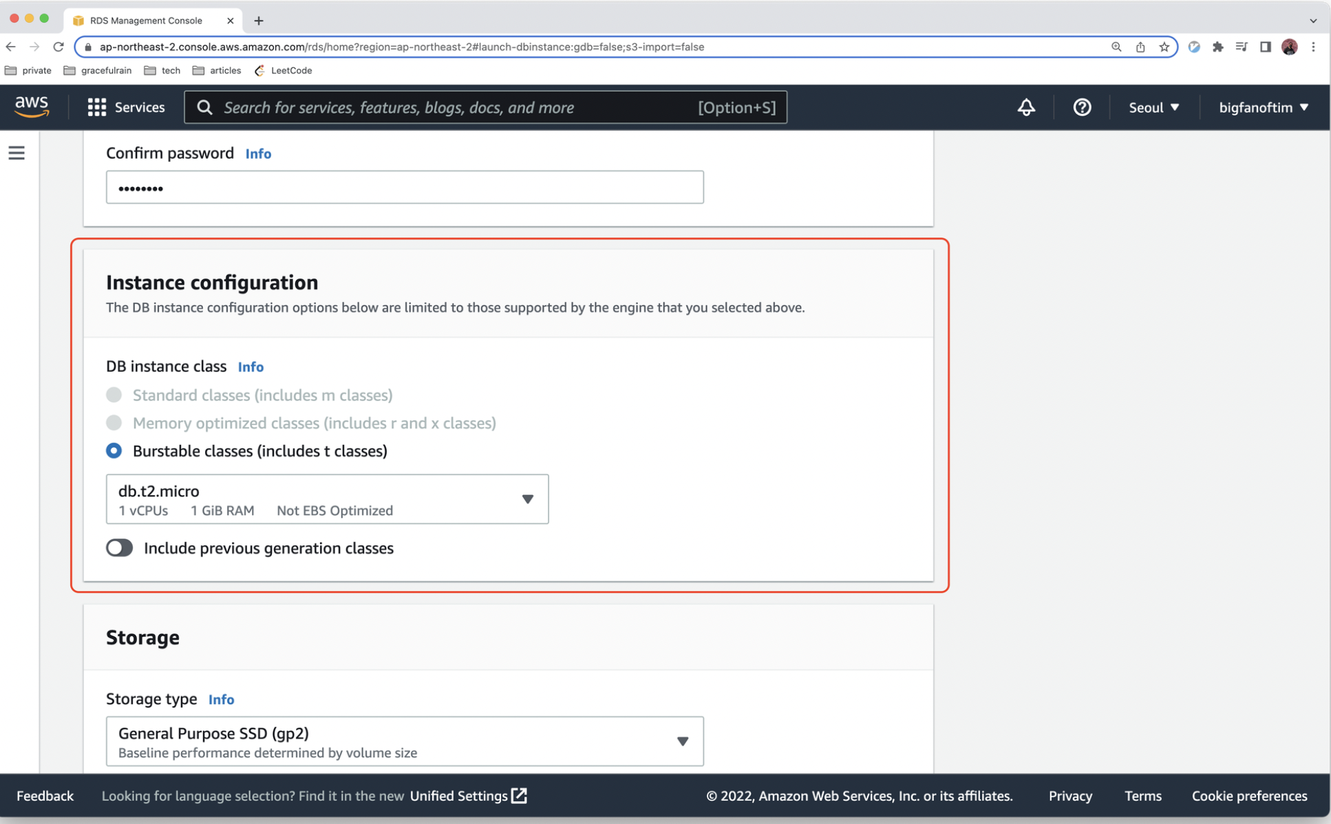 7. 다음으로 DB 인스턴스의 용량을 선택합니다.