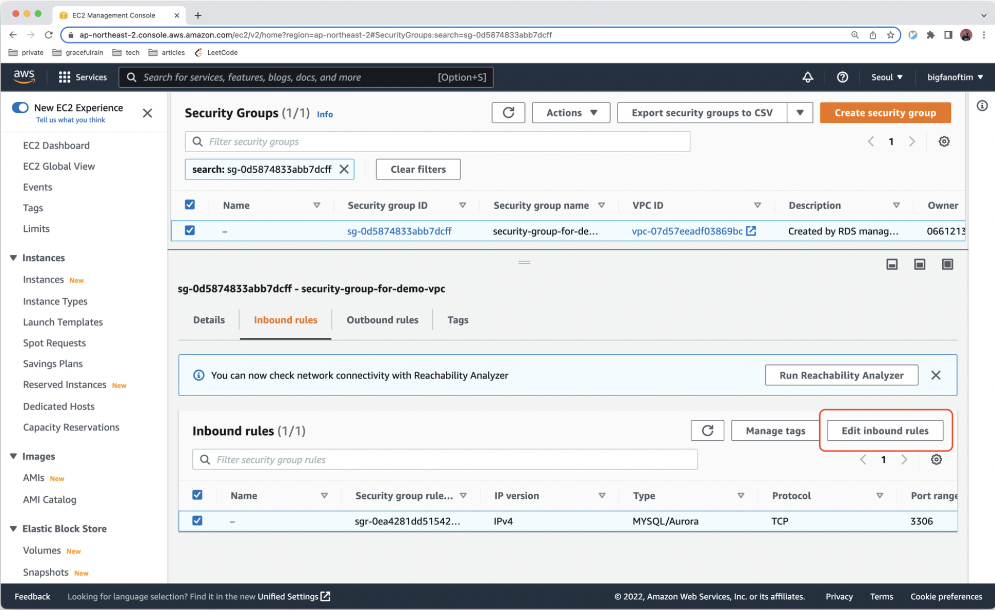 16. Edit inbound rules 를 클릭하여 인바운드 규칙을 다음 사진과 같이 수정합니다.
