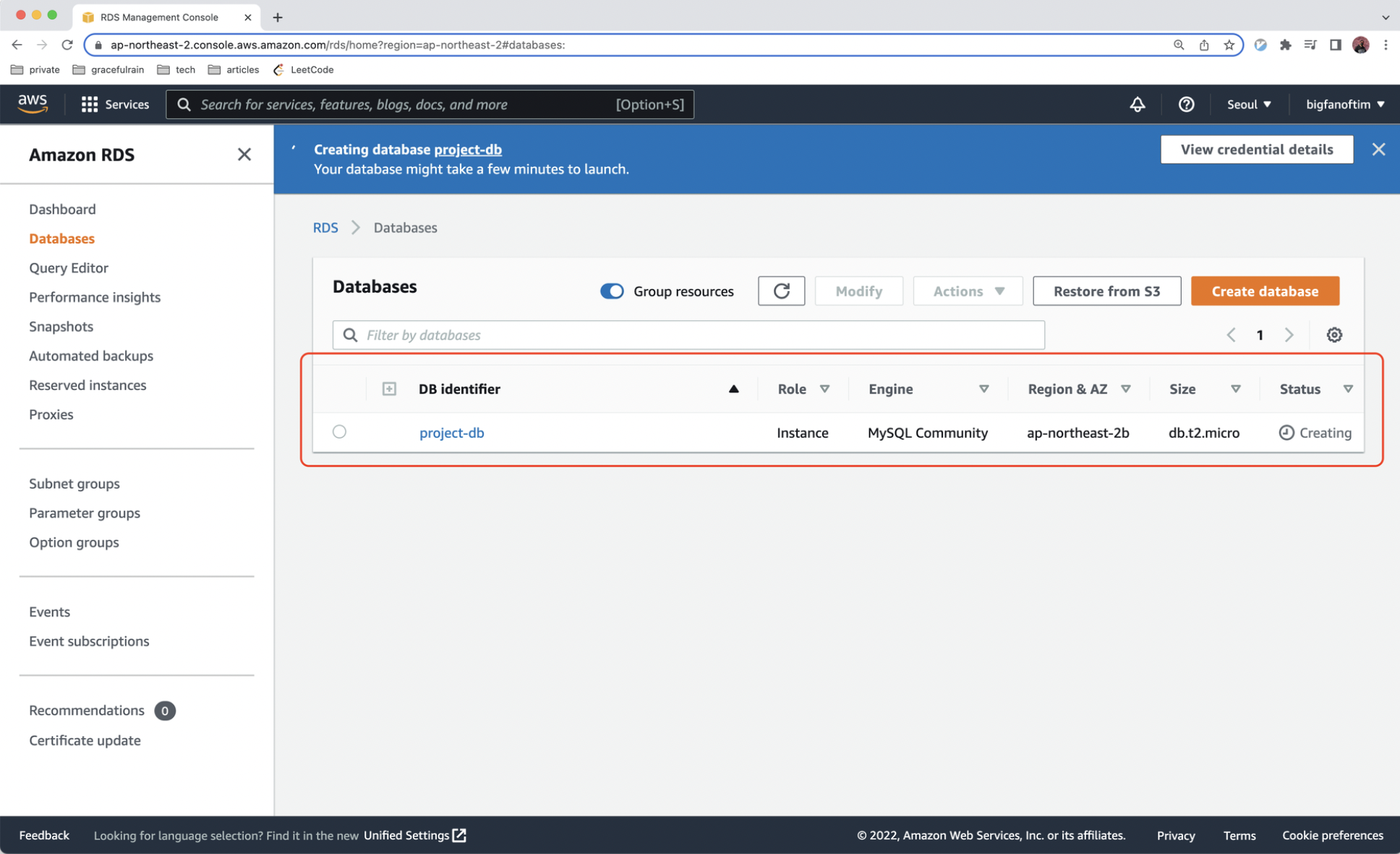 13. DB 인스턴스 목록을 보면 다음과 같이 생성중인 것을 볼 수 있습니다. 사용할 수 있을 때까지 몇 분 정도 소요될 수 있습니다.