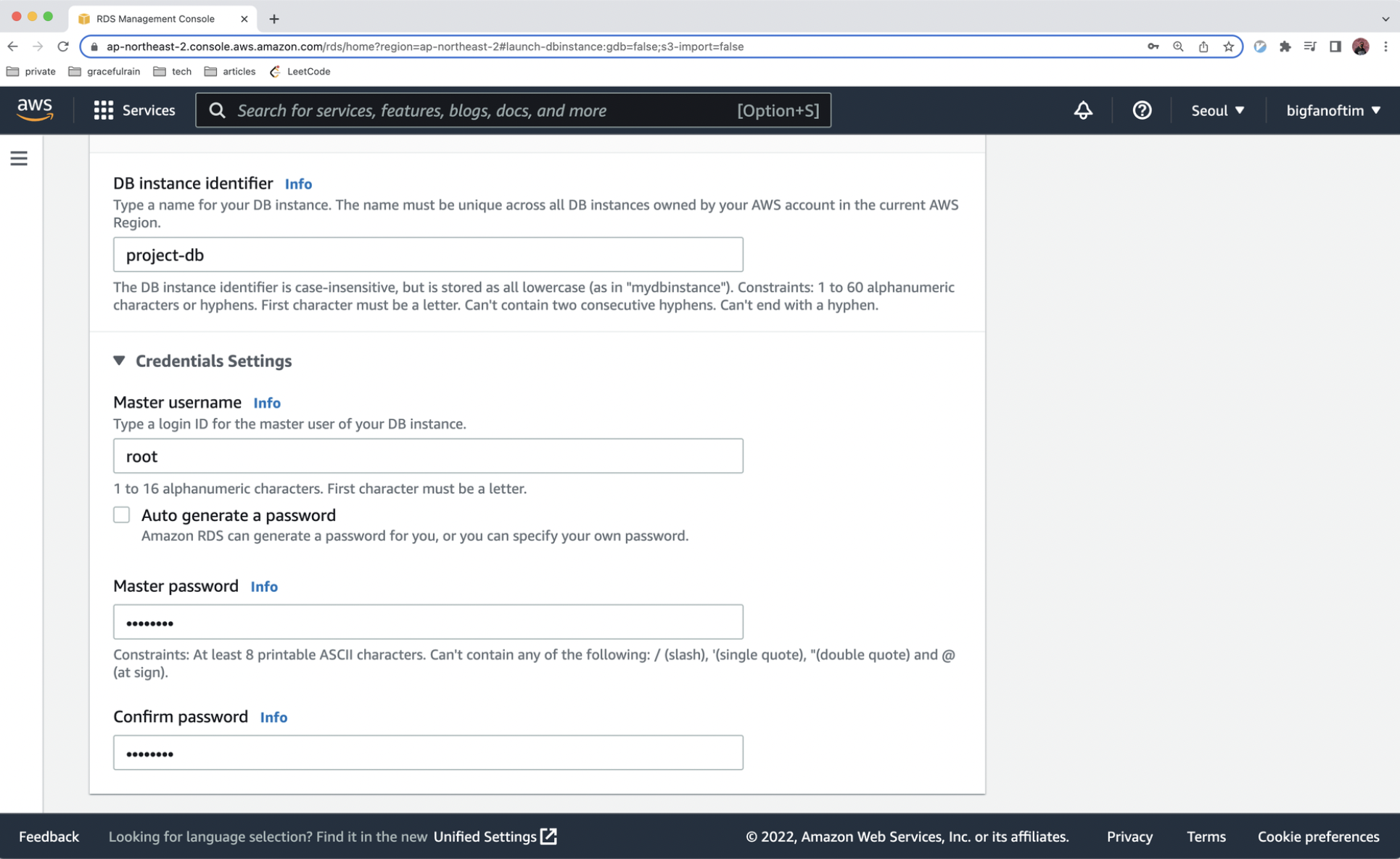 - Master username - 기존 MySQL과 같이 root로 설정하겠습니다.