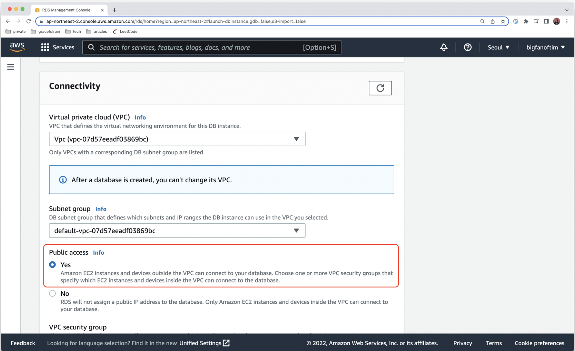 - Virtual private cloud (VPC) - 처음 계정을 생성했을 때 존재하는 Default VPC를 선택해주세요. VPC를 학습하기 전에 모든 퍼블릭 엑세스에 대한 설정이 되어 있습니다.