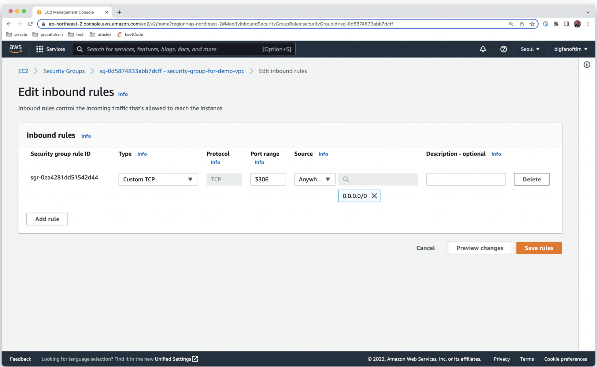 - Port range - MySQL을 사용하기 때문에 3306 포트를 지정합니다.