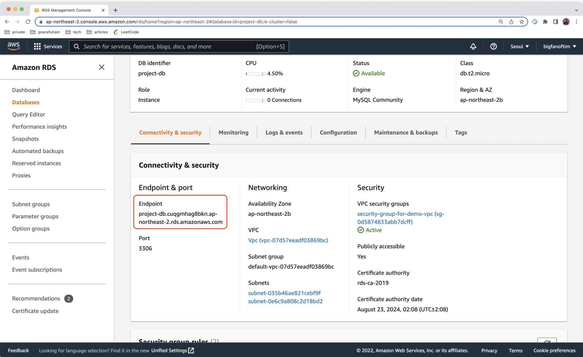 - 우선 생성한 DB 인스턴스의 Endpoint 를 복사합니다.[그림 2-18] Endpoint 확인