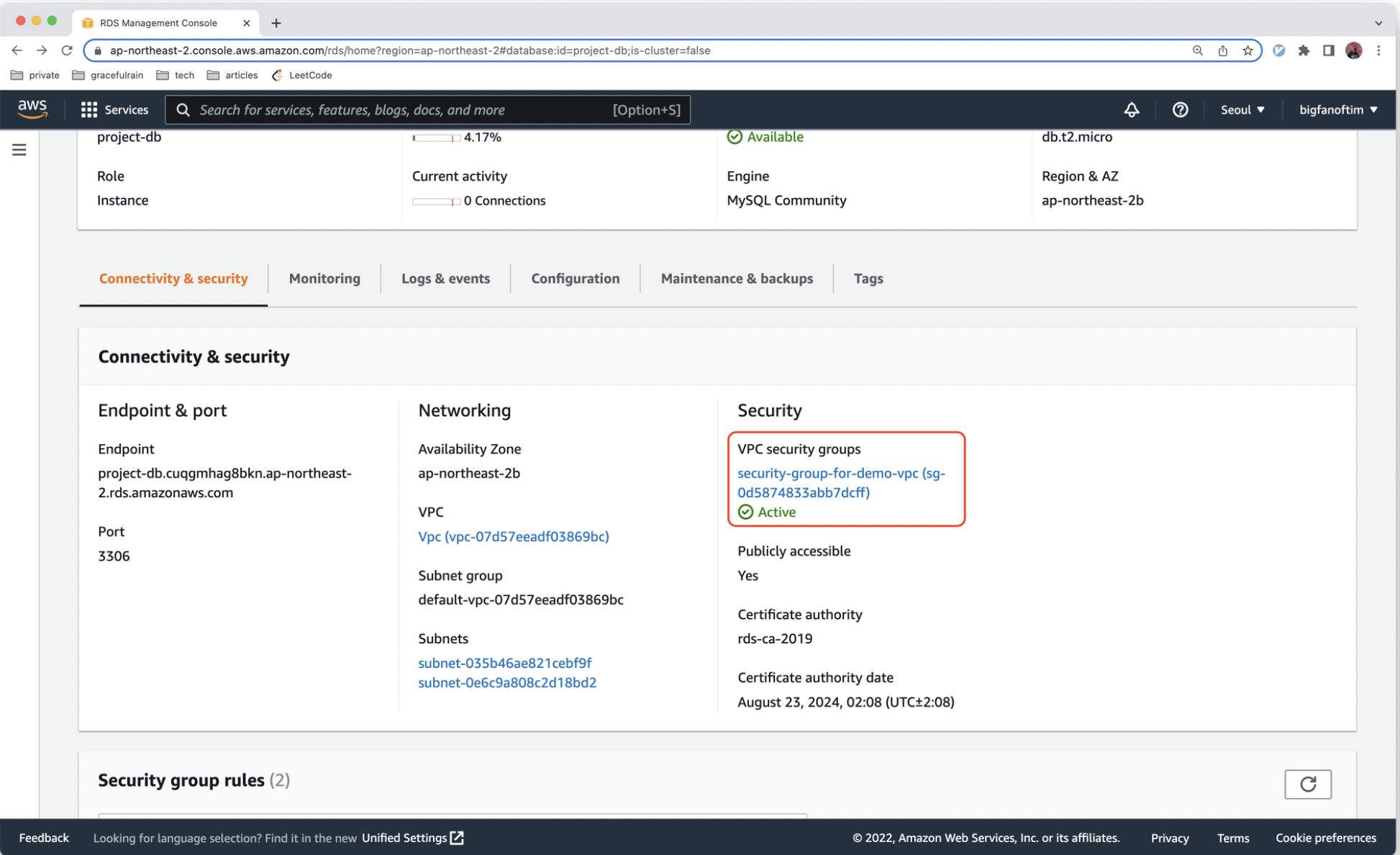 15. DB 인스턴스 생성 과정에서 만들었던 VPC security groups 을 클릭합니다.