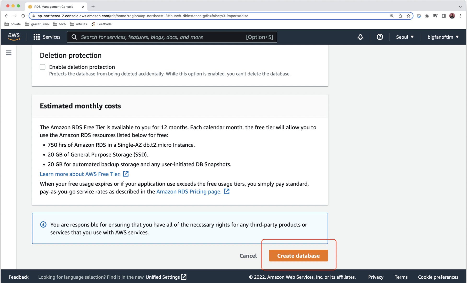 12. 설정을 마무리하고 Create database 를 클릭하여 DB 인스턴스를 생성합니다.