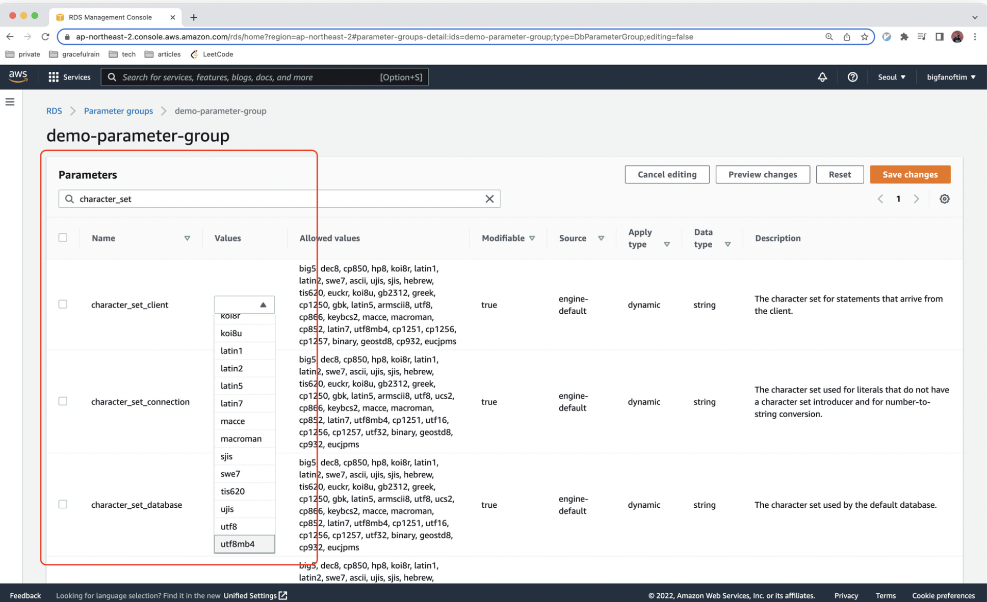 character_set 로 검색, Value를 수정