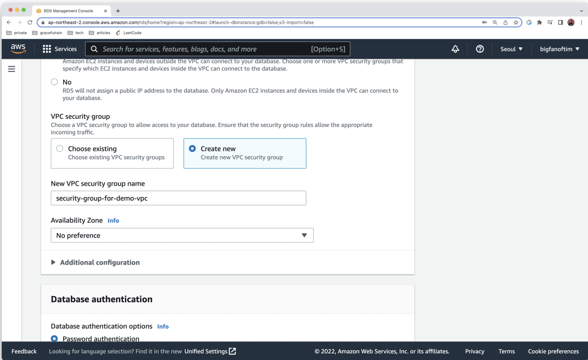 - Public access - 제일 중요한 퍼블릭 엑세스입니다. Yes 를 선택해야 곧바로 RDS에 접근할 수 있습니다. 하지만 실제 프로덕션 환경이라면 보안을 위해 퍼블릭 엑세스를 차단하고 동일한 VPC 내에 있는 다른 점프 서버를 두고 터널링해주는 방법을 사용하곤 합니다.