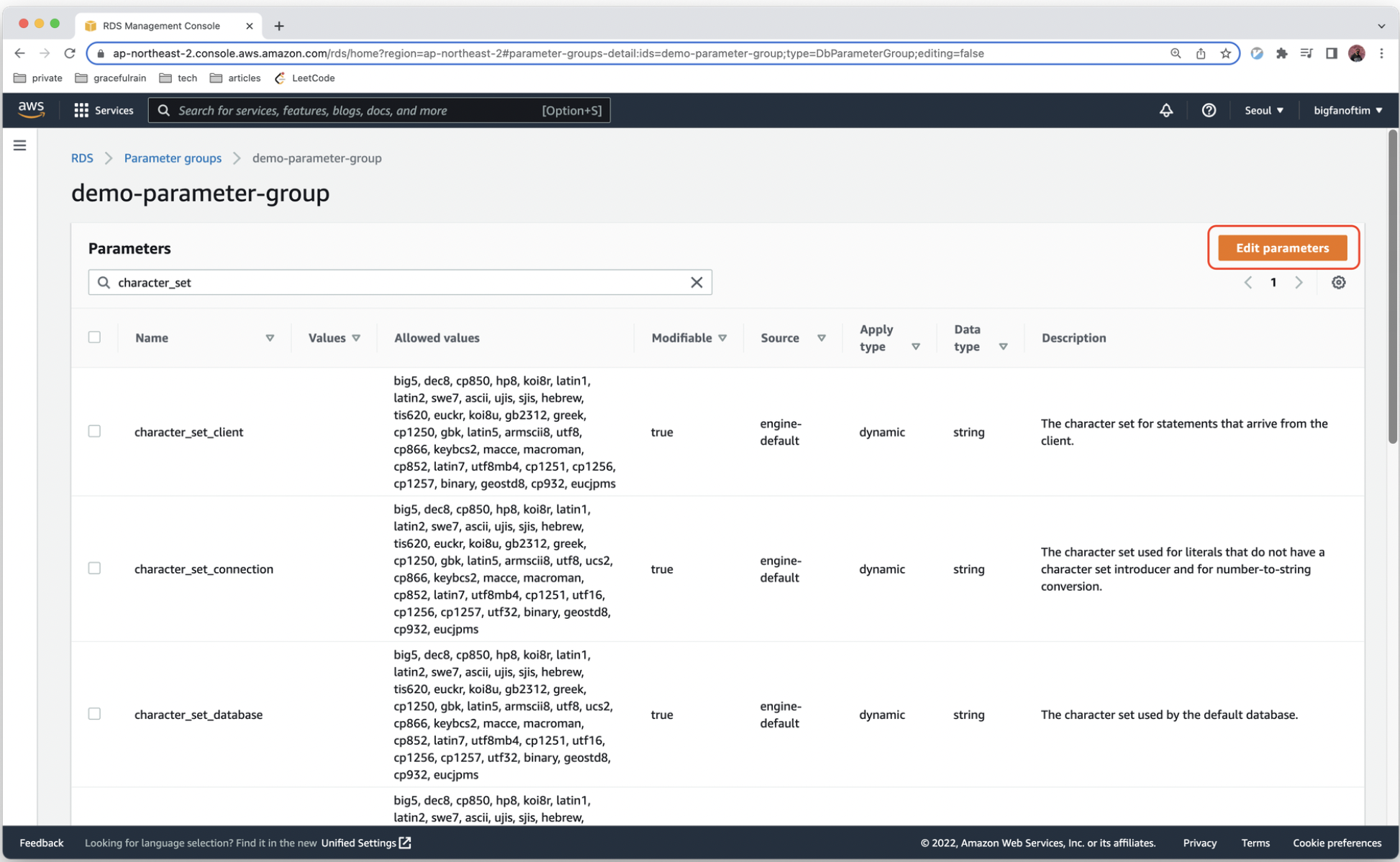 3-2. 생성한 Parameter Group 클릭하면, 아래 페이지로 이동됨