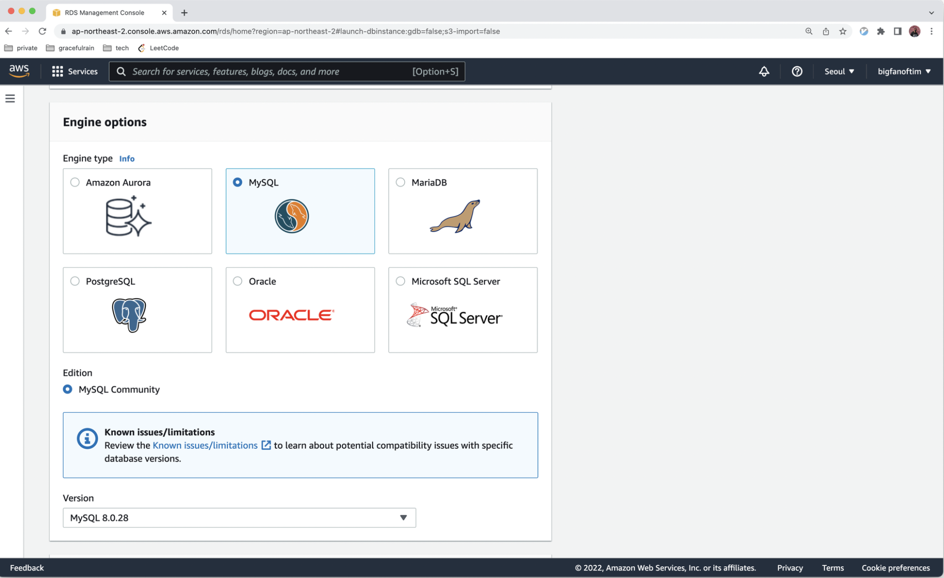 3. 데이터베이스 엔진은 MySQL을 선택합니다. 현재 진행중인 프로젝트에 맞는 버전을 선택해주세요.