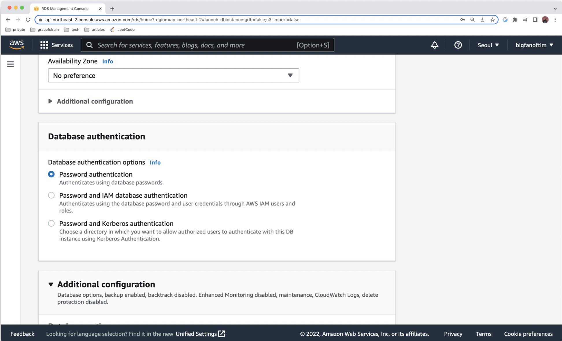 - Public access - 제일 중요한 퍼블릭 엑세스입니다. Yes 를 선택해야 곧바로 RDS에 접근할 수 있습니다. 하지만 실제 프로덕션 환경이라면 보안을 위해 퍼블릭 엑세스를 차단하고 동일한 VPC 내에 있는 다른 점프 서버를 두고 터널링해주는 방법을 사용하곤 합니다.
