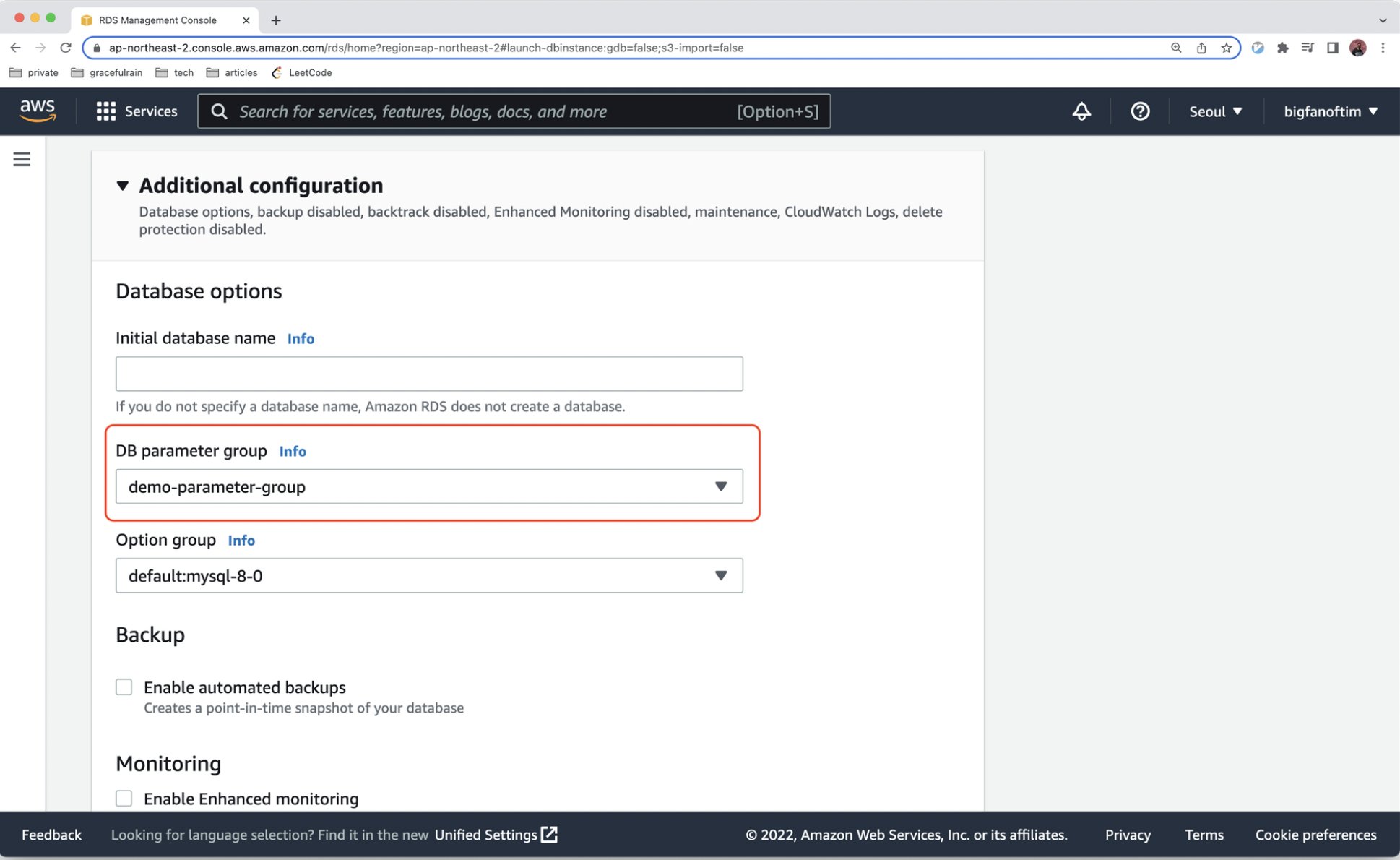 11. 추가 옵션에서 이전에 생성해둔 DB parameter group을 선택합니다