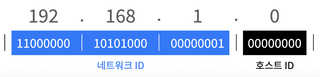IP 주소는 네트워크 ID호스트 ID 로 구분되어 있습니다. 네트워크 ID는 어떤 네트워크의 IP 주소인지를 나타내고, 호스트 ID는 해당 네트워크의 어느 컴퓨터인지를 나타내게 됩니다. IP 주소는 이 두 가지 ID를 합쳐서 만들어집니다.