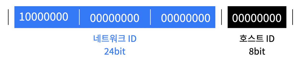 • 처음 24bit가 네트워크 ID, 나머지 8bit가 호스트 ID 입니다.