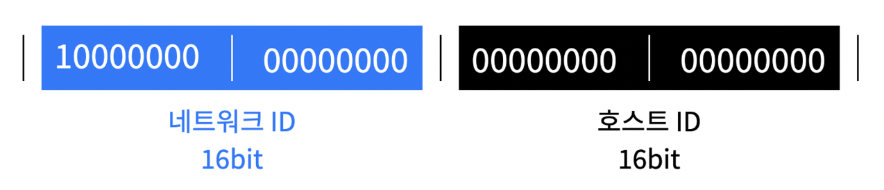 • 처음 16bit가 네트워크 ID, 나머지 16bit가 호스트 ID 입니다.